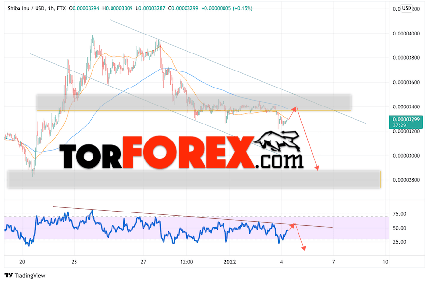 Дополнительным сигналом в пользу снижения котировок SHIB/USD на завтра выступит отскок от линии сопротивления на индикаторе относительной силы. Вторым сигналом станет отскок от верхней границы нисходящего канала. Отменой варианта снижения криптовалюты SHIBA INU станет сильный рост и пробой области 0.00003645. Это укажет на пробой области сопротивления и продолжение роста котировок SHIB/USD с целью выше уровня 0.00004255. Подтверждением падению криптовалюты выступит пробой области поддержки и закрытие котировок ниже уровня 0.00003125.