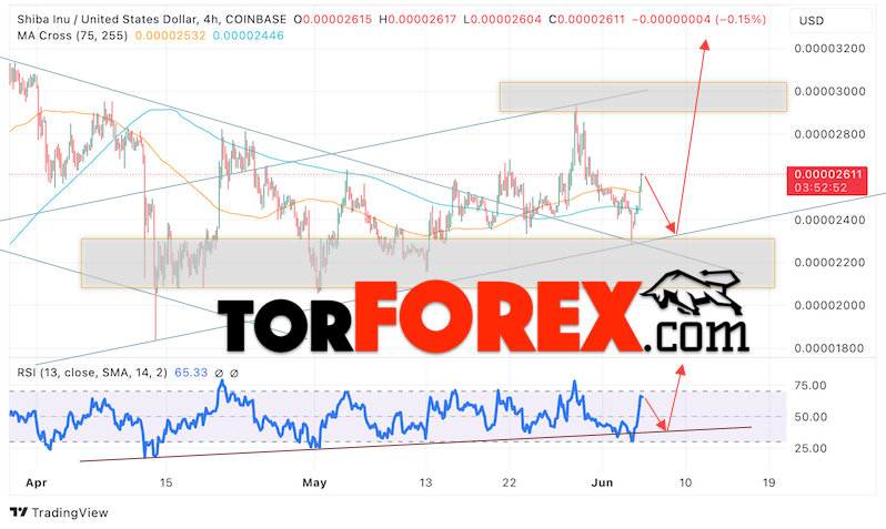 Дополнительным сигналом в пользу подъёма котировок актива SHIB/USD на завтра выступит отскок от линии поддержки на индикаторе относительной силы. Вторым сигналом станет отскок от нижней границы бычьего канала. Отменой варианта с ростом криптовалюты SHIBA INU станет падение и пробой области 0.00002205. Это укажет на пробой области поддержки и продолжение падения котировок SHIB/USD с целью ниже уровня 0.00001705. Подтверждением росту криптовалюты выступит пробой области сопротивления и закрытие котировок выше уровня 0.00002805.
