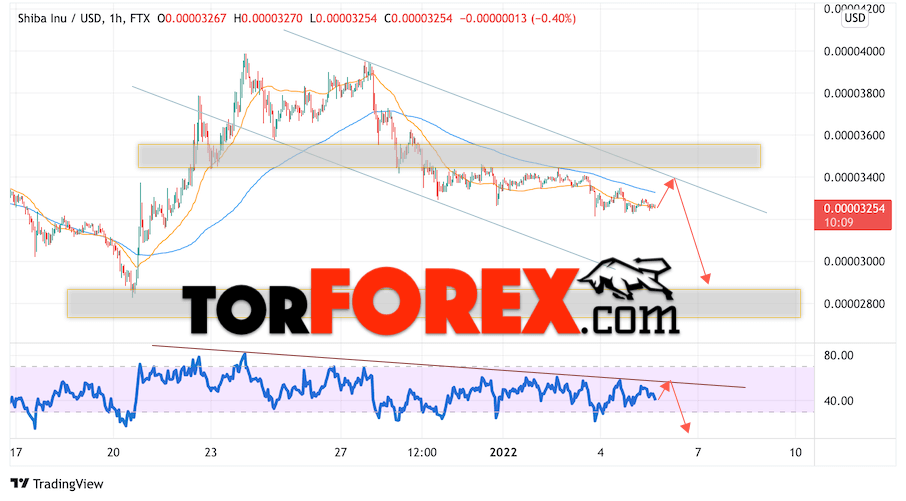 Дополнительным сигналом в пользу снижения котировок SHIB/USD на завтра выступит отскок от линии сопротивления на индикаторе относительной силы. Вторым сигналом станет отскок от верхней границы нисходящего канала. Отменой варианта снижения криптовалюты SHIBA INU станет сильный рост и пробой области 0.00003645. Это укажет на пробой области сопротивления и продолжение роста котировок SHIB/USD с целью выше уровня 0.00004205. Подтверждением падению криптовалюты выступит пробой области поддержки и закрытие котировок ниже уровня 0.00003005.