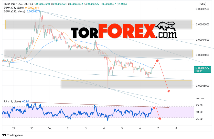 Дополнительным сигналом в пользу снижения котировок SHIB/USD на завтра выступит отскок от линии сопротивления на индикаторе относительной силы. Вторым сигналом станет отскок от верхней границы нисходящего канала. Отменой варианта роста криптовалюты SHIBA INU станет падение и пробой области 0.00004355. Это укажет на пробой области сопротивления и продолжение роста котировок SHIB/USD с целью выше уровня 0.00004995. Подтверждением падения криптовалюты выступит пробой области поддержки и закрытие котировок ниже уровня 0.00003005.