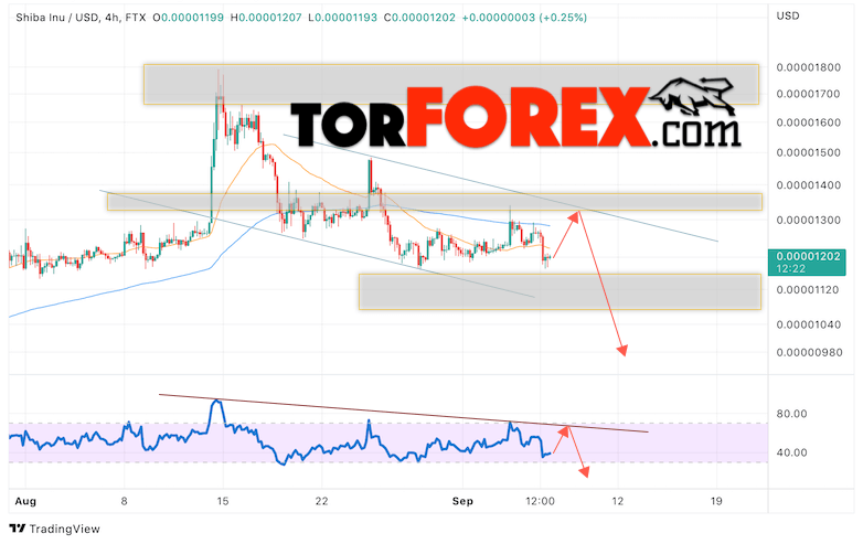 Дополнительным сигналом в пользу снижения котировок актива SHIB/USD на завтра выступит отскок от линии сопротивления на индикаторе относительной силы. Вторым сигналом станет отскок от верхней границы нисходящего канала. Отменой варианта с падением криптовалюты SHIBA INU станет сильный рост и пробой области 0.00001525. Это укажет на пробой области сопротивления и продолжение роста котировок SHIB/USD с целью выше уровня 0.00001855. Подтверждением падению криптовалюты выступит пробой области поддержки и закрытие котировок ниже уровня 0.00001105.