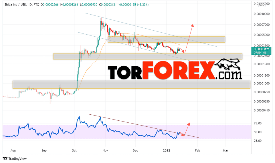 Дополнительным сигналом в пользу подъёма котировок SHIB/USD на текущей торговой неделе 17 — 21 января 2022 выступит тест линии поддержки на индикаторе относительной силы. Вторым сигналом станет отскок от нижней границы разворотной модели ”Двойное дно”. Отменой варианта роста криптовалюты SHIBA INU на следующей торговой неделе станет падение и пробой области 0.00002305. Это укажет на пробой области поддержки и продолжение падения котировок SHIB/USD с целью ниже уровня 0.00001505. Подтверждением подъёму криптовалюты выступит пробой области сопротивления и закрытие котировок выше уровня 0.00005255, что укажет на пробой верхней границы нисходящего канала.
