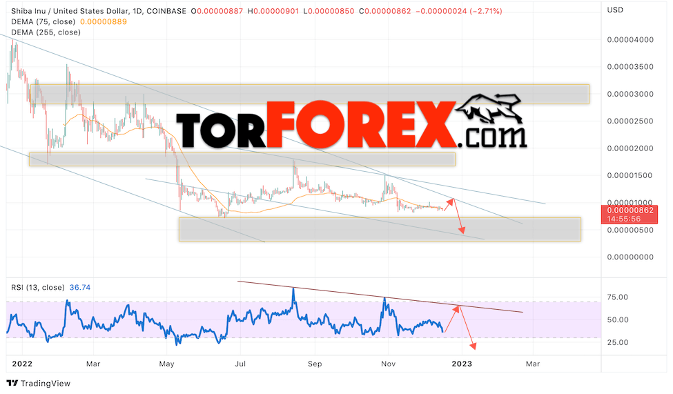 Дополнительным сигналом в пользу падения котировок SHIB/USD на текущей торговой неделе 19 — 23 декабря 2022 выступит тест линии сопротивления на индикаторе относительной силы. Вторым сигналом станет отскок от верхней границы нисходящего канала. Отменой варианта падения криптовалюты SHIBA INU на следующей торговой неделе станет сильный рост и пробой области 0.00001535. Это укажет на пробой области сопротивления и продолжение подъёма котировок SHIB/USD с целью выше уровня 0.00002345. Подтверждением падению криптовалюты выступит пробой области поддержки и закрытие котировок ниже уровня 0.00000745.