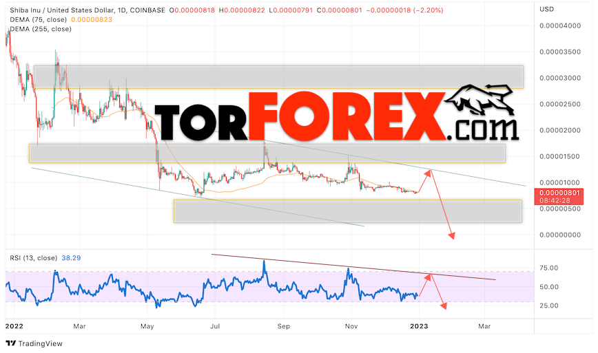 Таким образом, SHIBA INU прогноз на 2 — 6 января 2023 предполагает попытку теста области сопротивления вблизи уровня 0.00001035. Затем продолжение падения в область ниже уровня 0.00000265. Дополнительным сигналом в пользу снижения SHIBA INU выступит тест линии тренда на индикаторе относительной силы. Отменой варианта падения станет сильный рост и пробой области 0.00001645. Это укажет на продолжение подъёма криптовалюты с целью выше уровня 0.00002505.