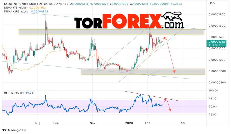 Таким образом, SHIBA INU прогноз на 27 февраля — 3 марта 2023 предполагает попытку теста области поддержки вблизи уровня 0.00001405. Затем продолжение падения в область выше уровня 0.00000775. Дополнительным сигналом в пользу подъёма SHIBA INU выступит тест линии тренда на индикаторе относительной силы. Отменой варианта роста станет падение и пробой области 0.00001735. Это укажет на продолжение снижения криптовалюты с целью ниже уровня 0.00002165.