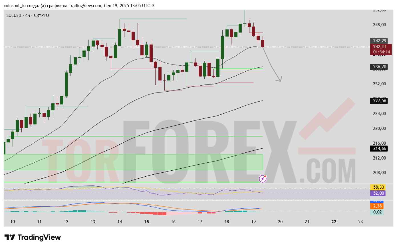 Нисходящий сценарий: Если продавцы удержат свои позиции, цена может продолжить падение. Пробой текущего минимума откроет путь к поддержке в зоне 236, а затем к 232–227. Подтверждением этого сценария станет закрепление ниже EMA 50.