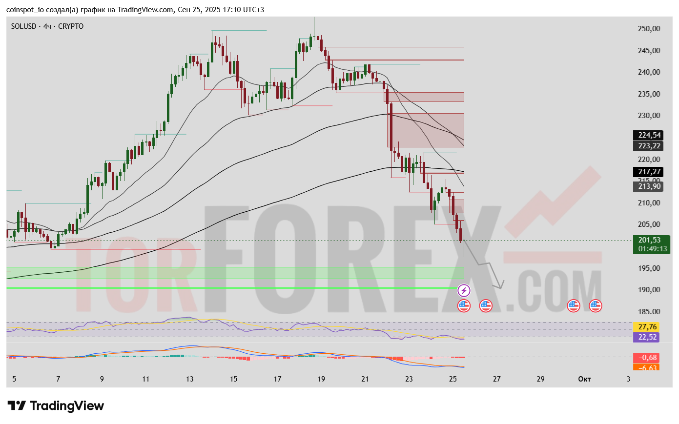 - Нисходящий сценарий: Если медведи смогут пробить уровень 201.40, то падение, скорее всего, продолжится. Следующей целью станет FVG-зона в районе 195 и далее к 190. Этот сценарий будет подтвержден, если цена не сможет вернуться выше EMA 20.