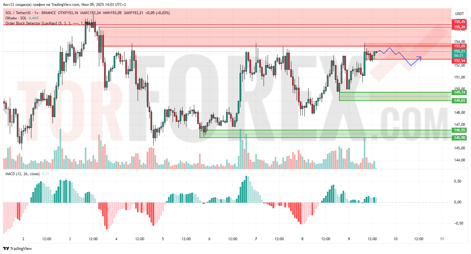 SOL/USD подошёл к нижней границе зоны предложения 153.65–155.45, где уже неоднократно фиксировалось давление продавцов. Цена пытается закрепиться выше 153.00, но рост замедляется, а объёмы не подтверждают сильного бычьего импульса. Пробой вверх пока не подтверждён, и возможна краткосрочная коррекция.