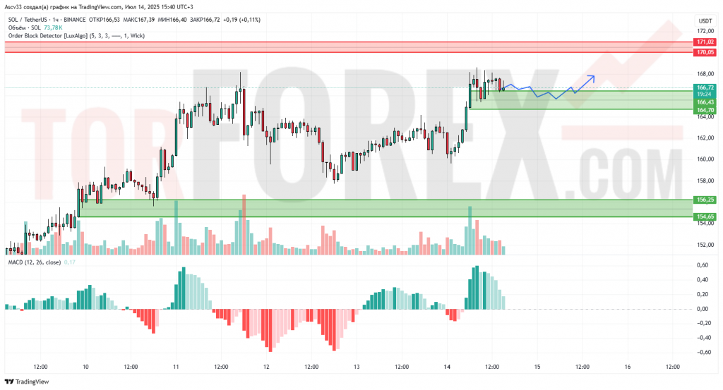 166,43–164,70 — локальная зона, где цена консолидируется после импульса. Ниже — основная поддержка 156,25–154,65, откуда началось последнее восходящее движение.