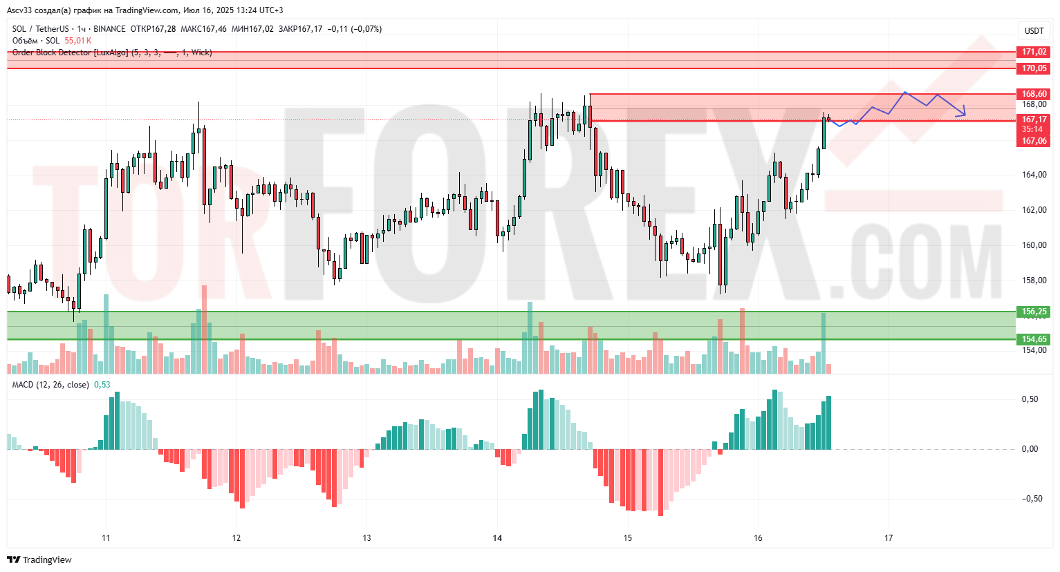 Ожидается колебание в пределах зоны 167–169. Если активу удастся закрепиться выше 169, движение может продолжиться к 171 и выше. При откате вероятен возврат к поддержке 162–160 или ниже — к 156. Сценарий отката выглядит более вероятным, учитывая насыщенность зоны продавцов и текущий объём.