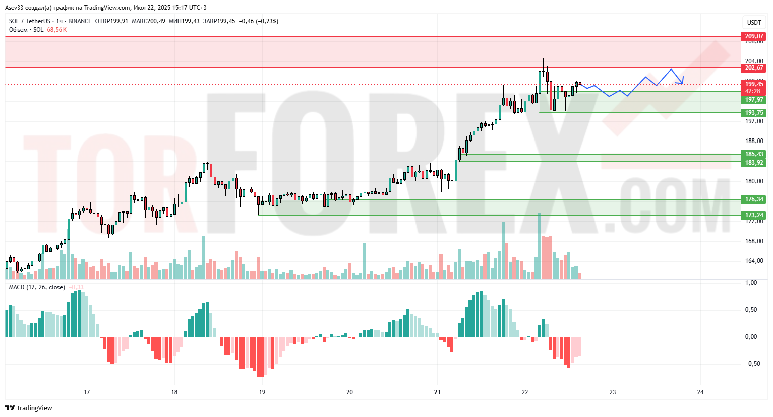 202.6–209.0 — зона, где ранее фиксировалась прибыль и происходил разворот вниз. Пробой уровня 204 закрепит потенциал роста к 209 и выше.