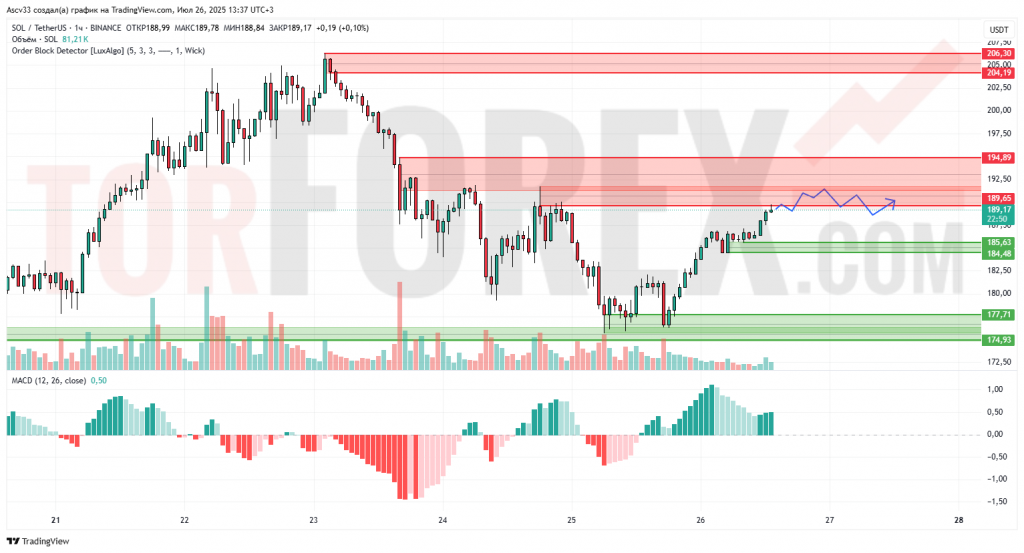При успешном пробое и закреплении выше зоны сопротивления 189.65 – 194.89, пара SOL/USDT имеет потенциал для дальнейшего роста в направлении 204.19 – 206.30. Однако, в случае неудачного пробоя и отката, возможна коррекция к ближайшим зонам поддержки 185.62 – 184.48. Основным сценарием является продолжение восходящего движения с возможными краткосрочными консолидациями вблизи уровней сопротивления.