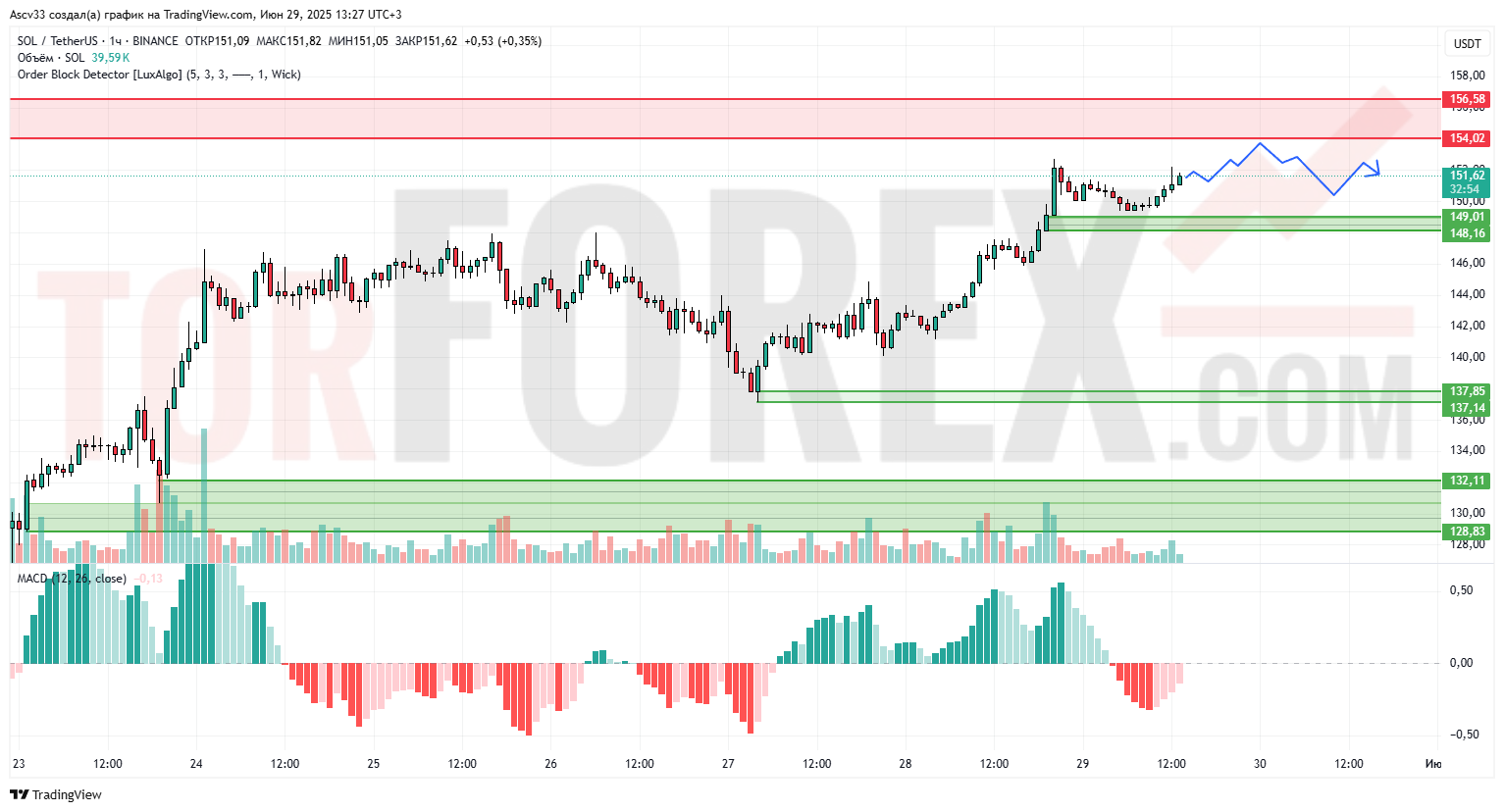 SOL/USDT уверенно восстановился от зоны поддержки 137–138 и закрепился выше локального уровня 149, тестируя область сопротивления 154. Движение вверх сопровождается умеренным ростом объёмов, что говорит о наличии интереса со стороны покупателей.
