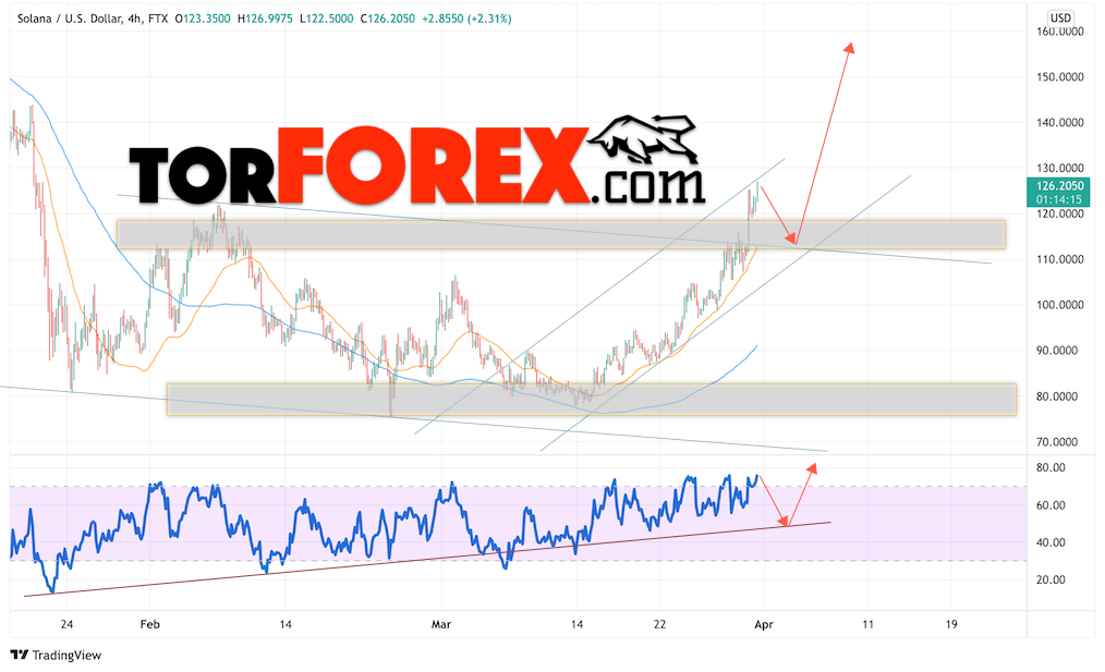 Таким образом, Solana прогноз курса на 1 апреля 2022 предполагает попытку коррекции и тест области поддержки вблизи уровня 115.05. Откуда стоит ожидать отскок и продолжения роста SOL/USD в область выше уровня 160.05. Дополнительным сигналом в пользу роста Solana выступит тест линии тренда на индикаторе относительной силы. Отменой варианта подъёма станет падение и пробой области 105.05. Это укажет на продолжение падения криптовалюты с целью ниже уровня 85.05.