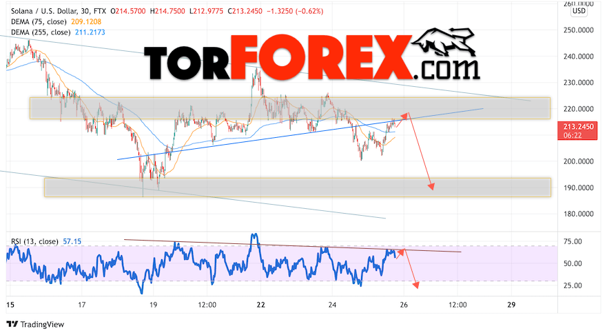 В пользу падения котировок и курса SOL/USD выступит тест линии тренда на индикаторе относительной силы. Вторым сигналом станет отскок от нижней границы разворотной модели ”Голова и плечи”. Отменой варианта падения монеты станет сильный рост стоимости актива и пробой области 235.05. Это укажет на пробой области сопротивления и продолжение роста курса криптовалюты с потенциальной целью выше уровня 265.05. С пробоем области поддержки и закрытием котировок ниже уровня 205.05 стоит ожидать подтверждения падения цены.