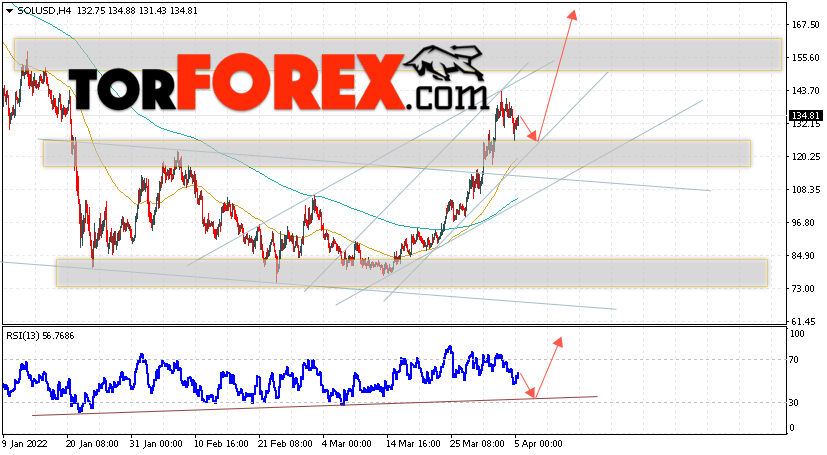 Таким образом, Solana прогноз курса на 6 апреля 2022 предполагает попытку коррекции и тест области поддержки вблизи уровня 130.05. Откуда стоит ожидать отскок и продолжения роста SOL/USD в область выше уровня 170.55. Дополнительным сигналом в пользу роста Solana выступит тест линии тренда на индикаторе относительной силы. Отменой варианта подъёма станет падение и пробой области 110.05. Это укажет на продолжение падения криптовалюты с целью ниже уровня 85.05.