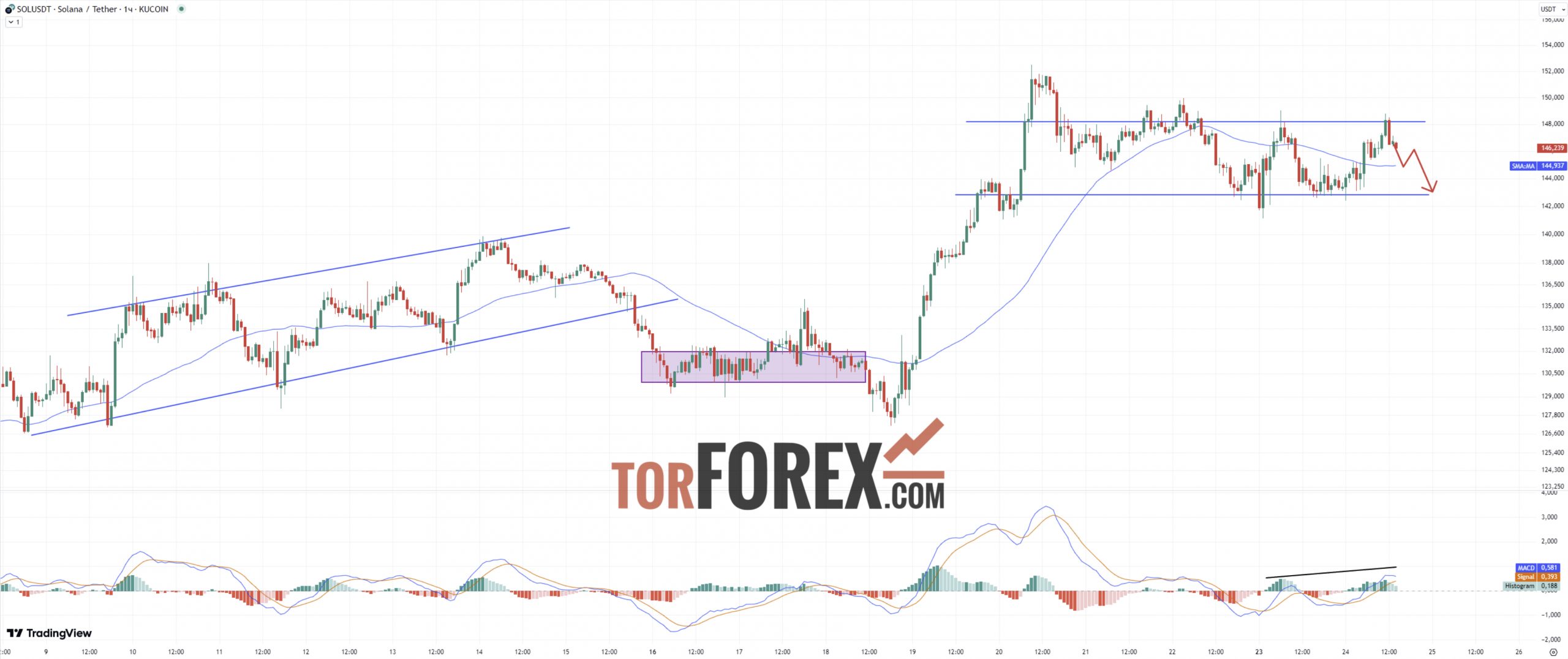 Цена Солана продолжает движение в рамках параллельного торгового диапазона с границами $143 — $148. На данный момент солана торгуется по $144. Скользящая средняя развернута вниз и указывает на завершение бычьего тренда. Вероятнее всего sol usdt прогноз курса продолжит движение в рамках торгового диапазона, отскочив от верхней границы (сопротивления) и направится в нижней границе (поддержке).