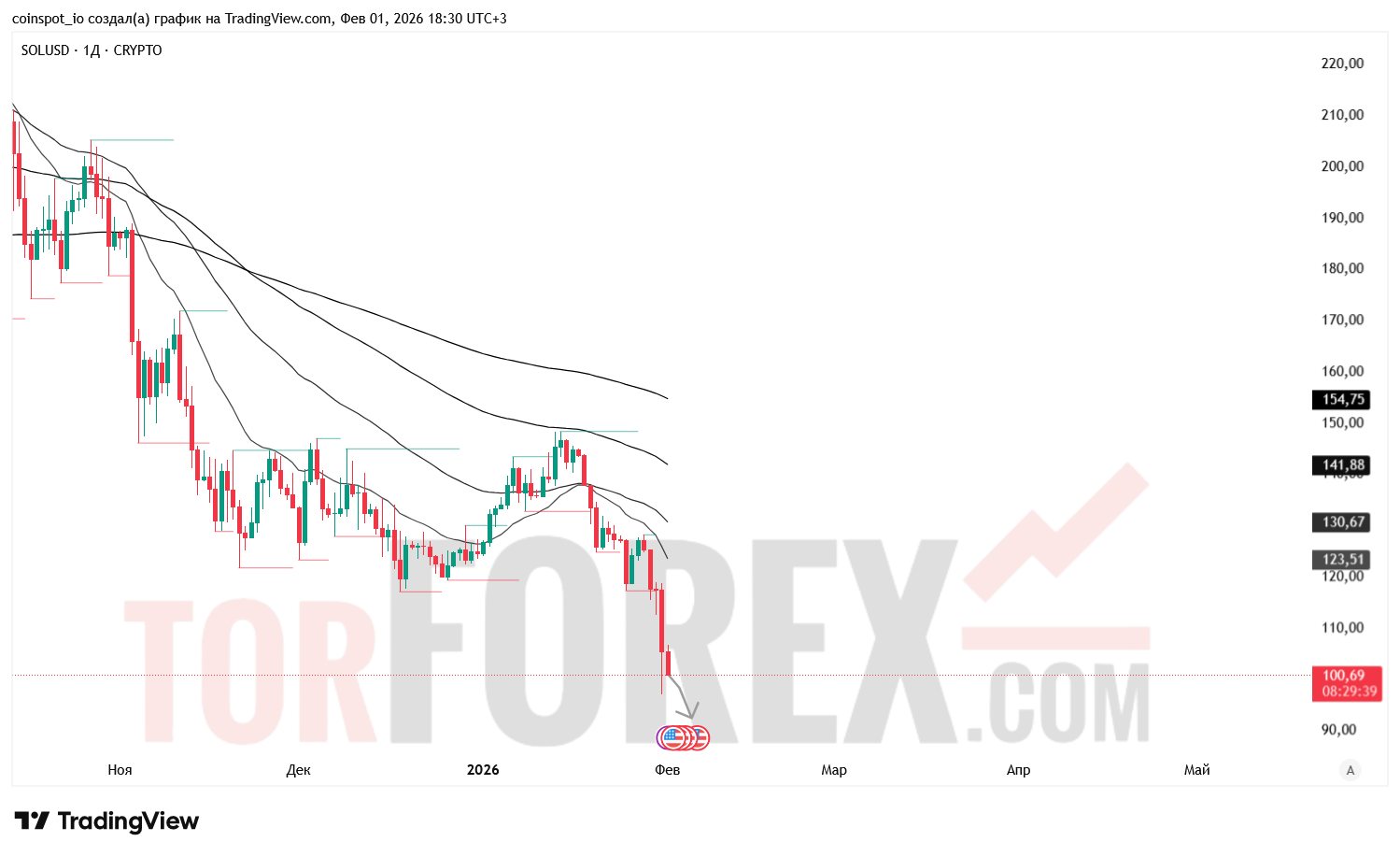 Торговая пара SOL/USD завершает январь резким снижением к области 100–101 USD, потеряв более 4% за последнюю дневную свечу. На графике фиксируется ускорение нисходящего импульса после пробоя ключевых уровней и выхода из среднесрочного восходящего диапазона. Давление усиливается на фоне общего снижения крипторынка и усиления доллара. Волатильность остаётся высокой, что формирует насыщенный технический фон для начала февраля.