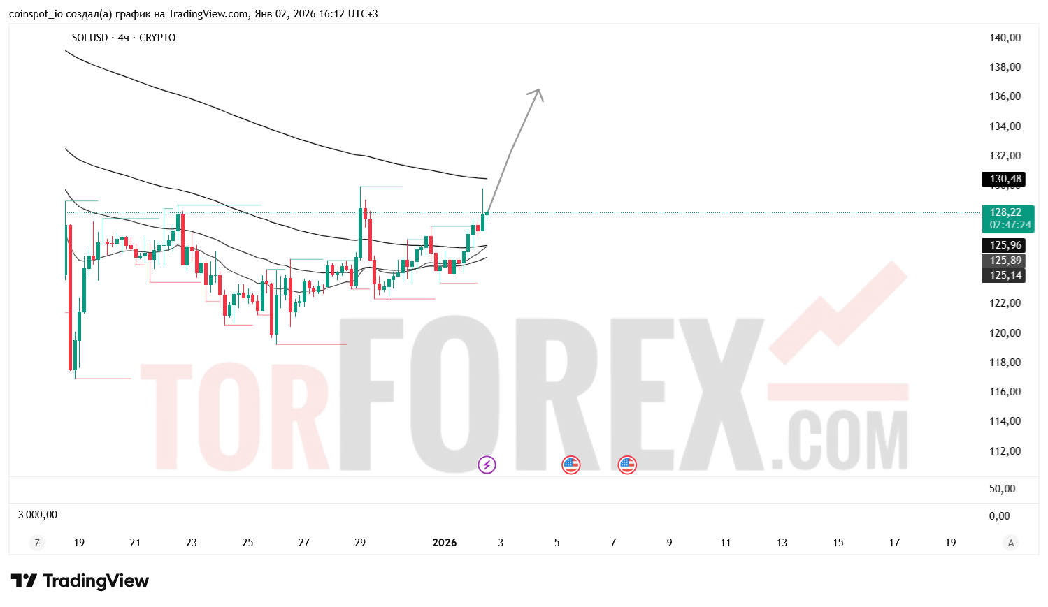 На 3 января 2026 года SOL/USD сохраняет нейтрально-бычью структуру с признаками устойчивого восстановления. Основной сценарий — рост к 132.50–136.50 USD при пробое зоны сопротивления. Альтернативный сценарий — откат к 124.50–121.00 USD при отказе от уровня 128.33 USD.