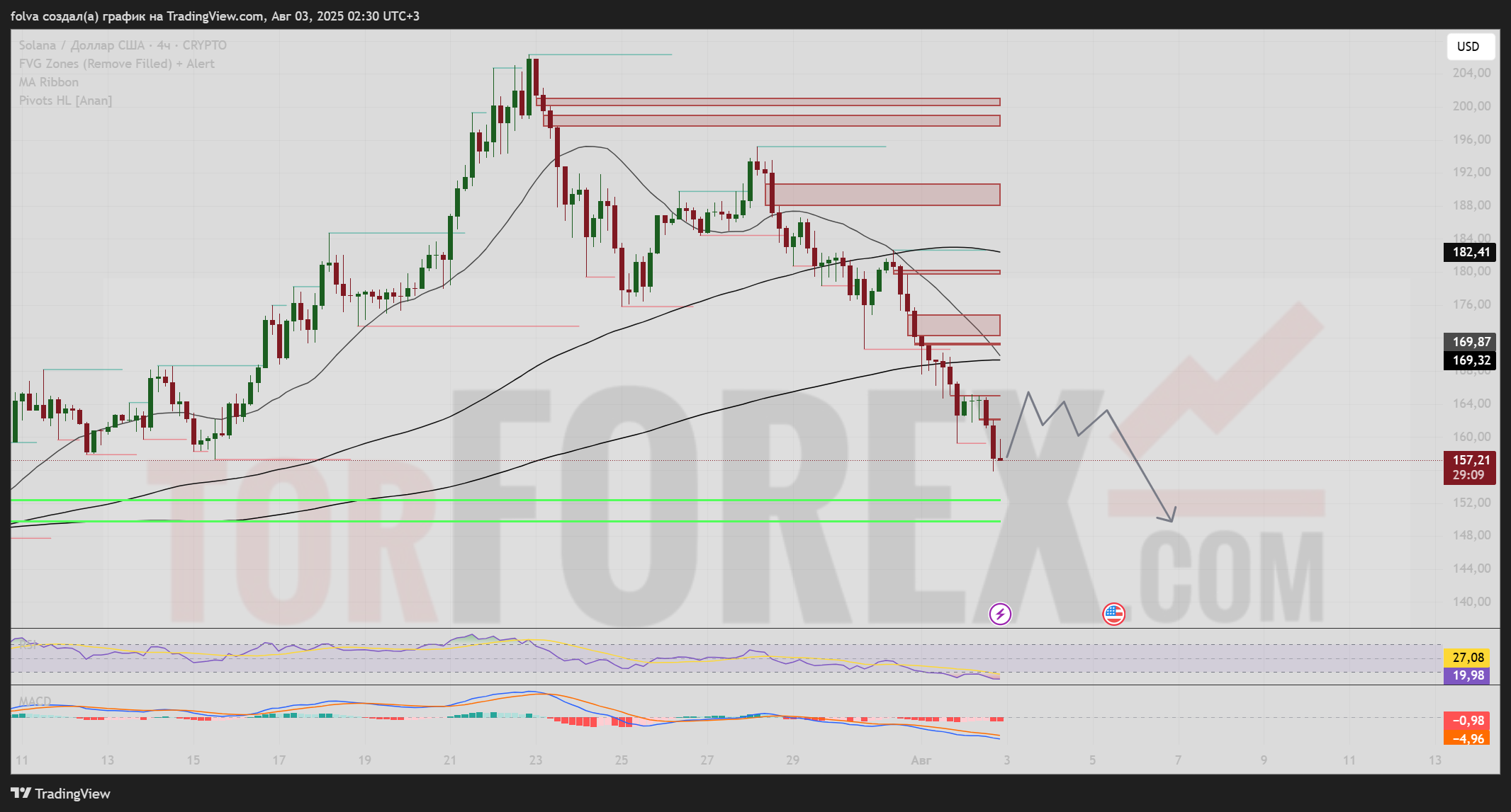 Торговая пара SOL/USD завершает начало августа под сильным давлением продавцов. Цена пробила ключевые уровни поддержки и достиг зоны $157,40, находясь в пределах области спроса. Медвежий импульс сохраняется, структура на 4H-темпоральности остаётся нисходящей. При этом индикаторы начинают демонстрировать признаки локального истощения тренда, что может привести к коррекции. Ниже представлен подробный технический прогноз с использованием Pivot HL, FVG, EMA-лент, а также индикаторов RSI и MACD.