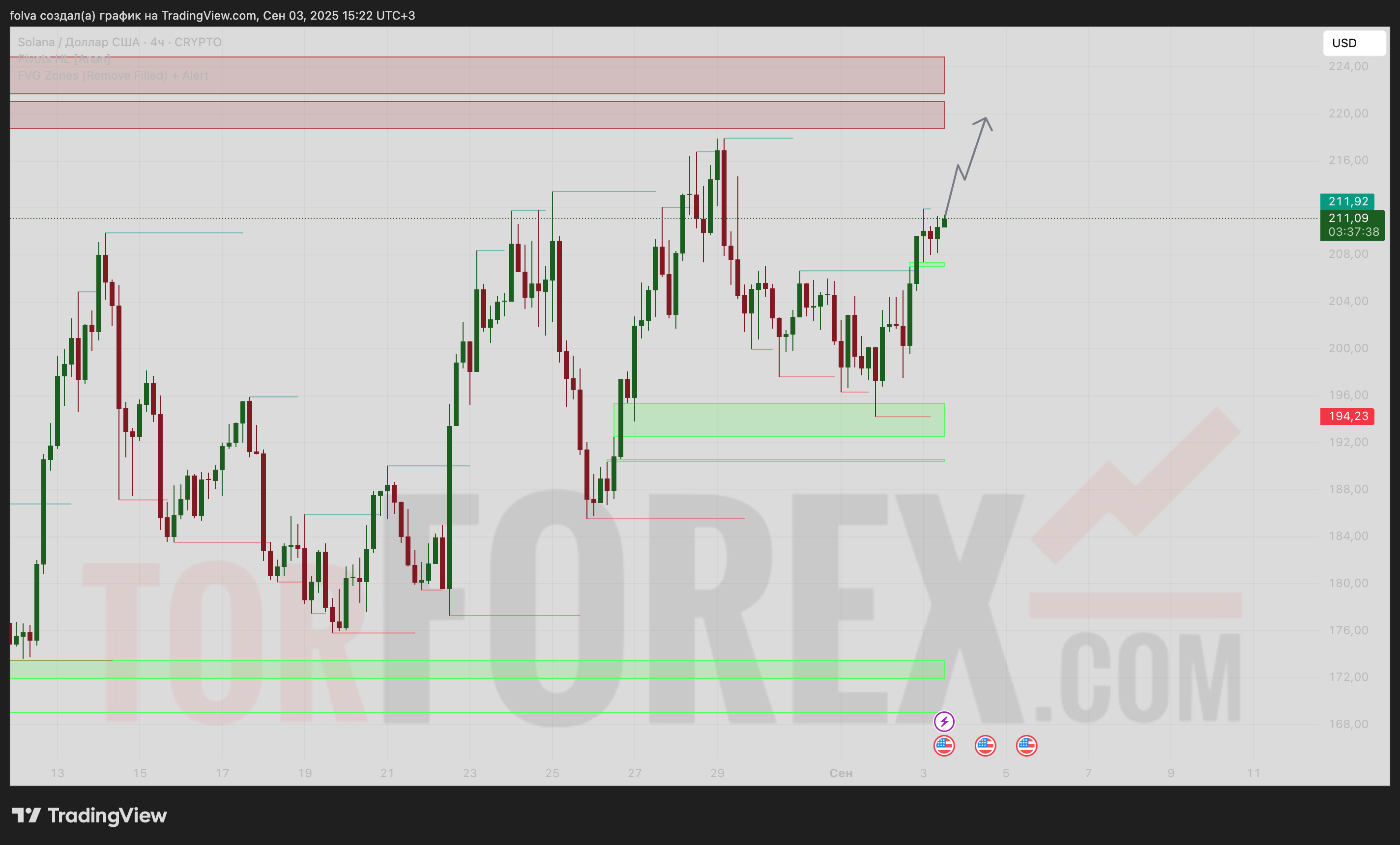 Если Solana сумеет пробить уровень 212 и закрепиться выше 215, то следующей целью станет зона 220–225. При усилении покупательского давления рынок способен протестировать 228–230, что будет соответствовать продолжению среднесрочного восходящего тренда.