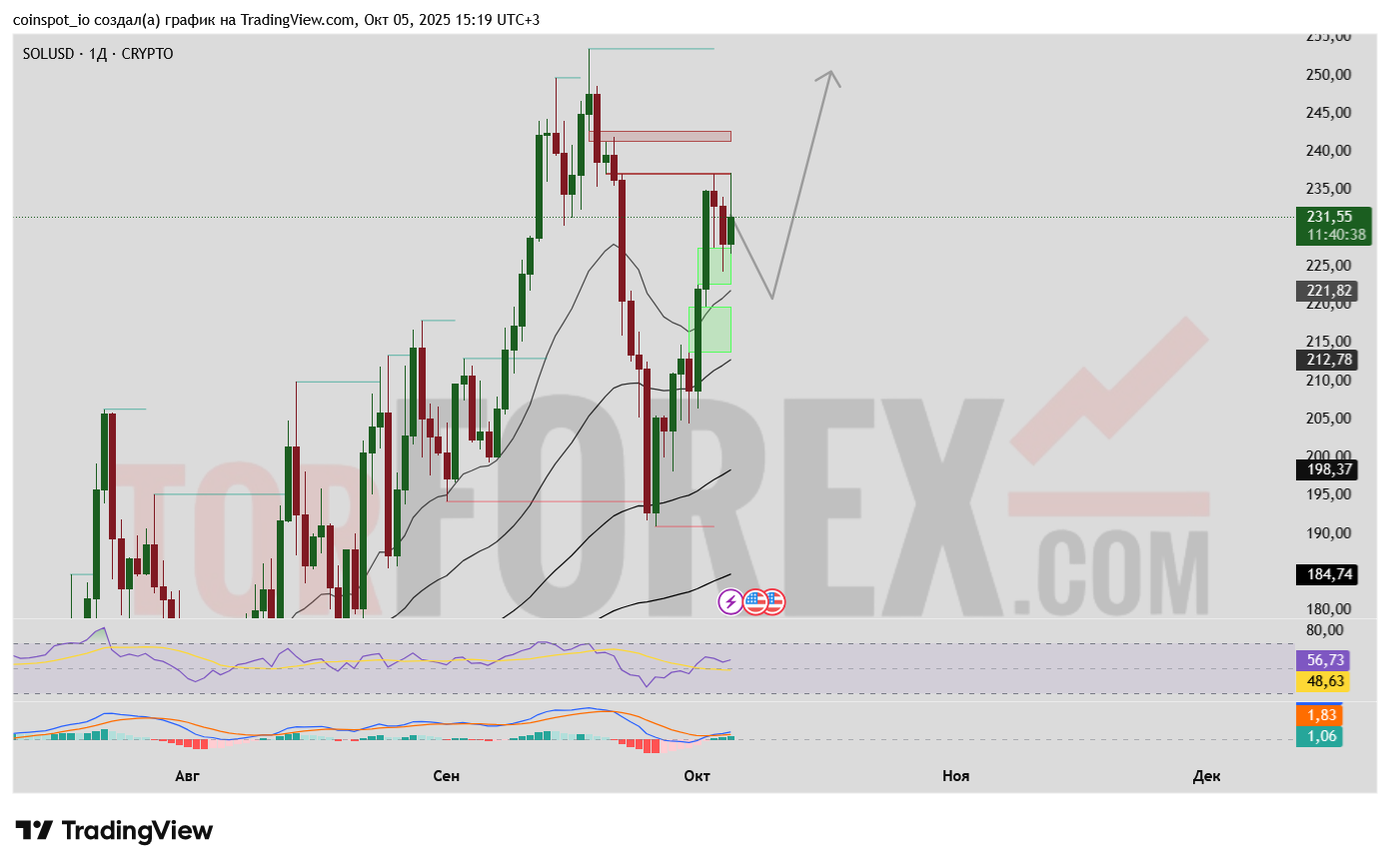 Технический прогноз для SOL/USD на 6-13 октября 2025 года предполагает боковое движение в диапазоне 210.00 — 250.00. Для покупок (лонгов) зоной входа является нижняя граница диапазона 210.00-220.00 с целью роста к 250.00, а для продаж (шортов) — верхняя граница 240.00-250.00 с целью снижения к 210.00. Ключевым для определения дальнейшего направления станет пробой любой из границ этого диапазона с подтверждением по объему.