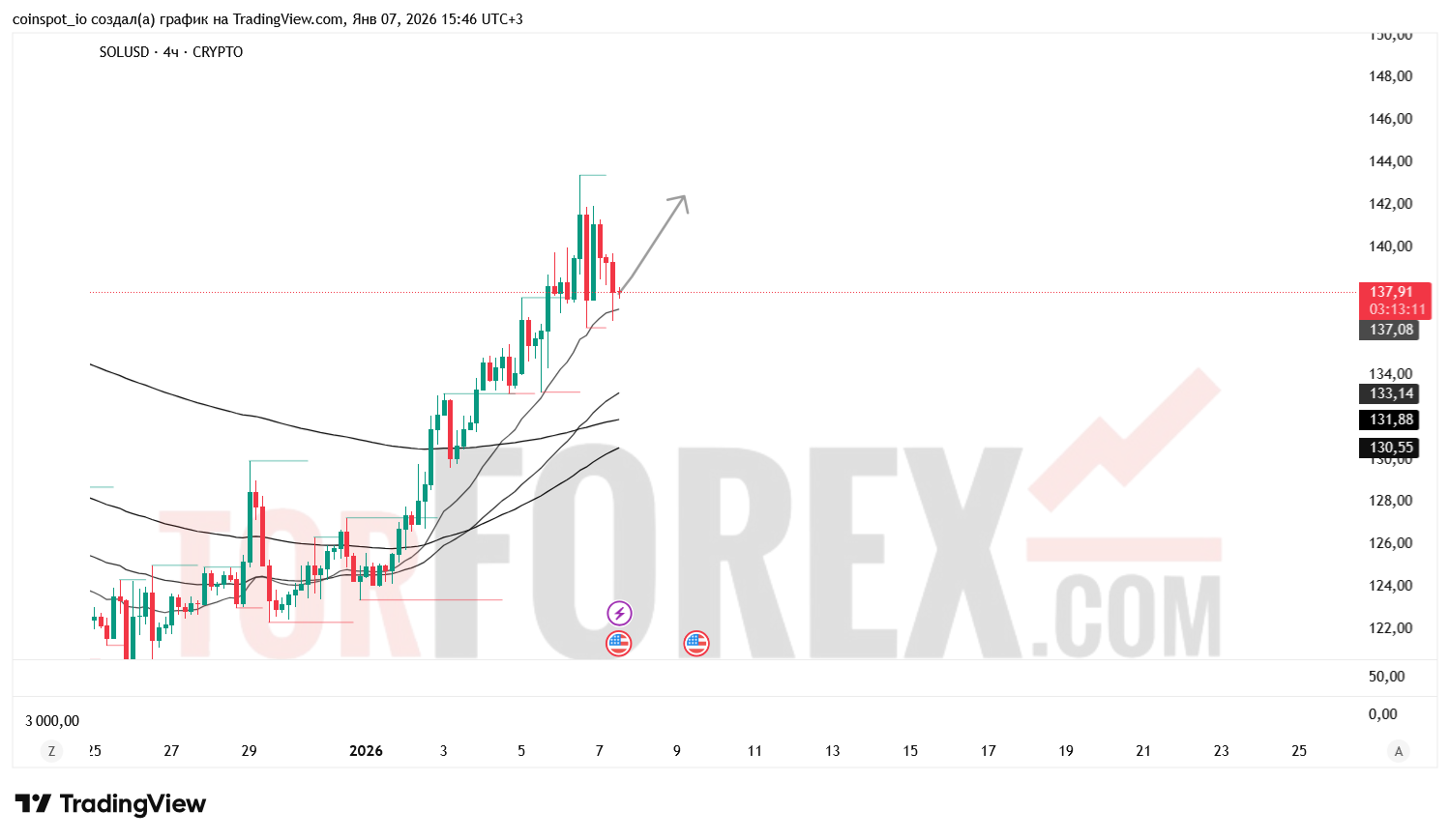 На 8 января 2026 года SOL/USD сохраняет нейтрально-бычью структуру с признаками коррекции. Основной сценарий — восстановление к 142.39–146.50 USD при пробое EMA 20. Альтернативный сценарий — углубление отката к 131.88–130.55 USD при отказе от уровня 137.74 USD.
