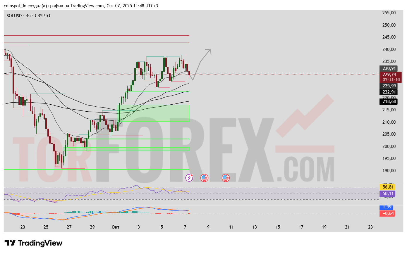 Для продавцов: Короткие позиции актуальны при отказе цены от сопротивления EMA 50-200 и пробое поддержки EMA 20. Целью для продаж выступает зона FVG в районе 222.00-225.00 USD.