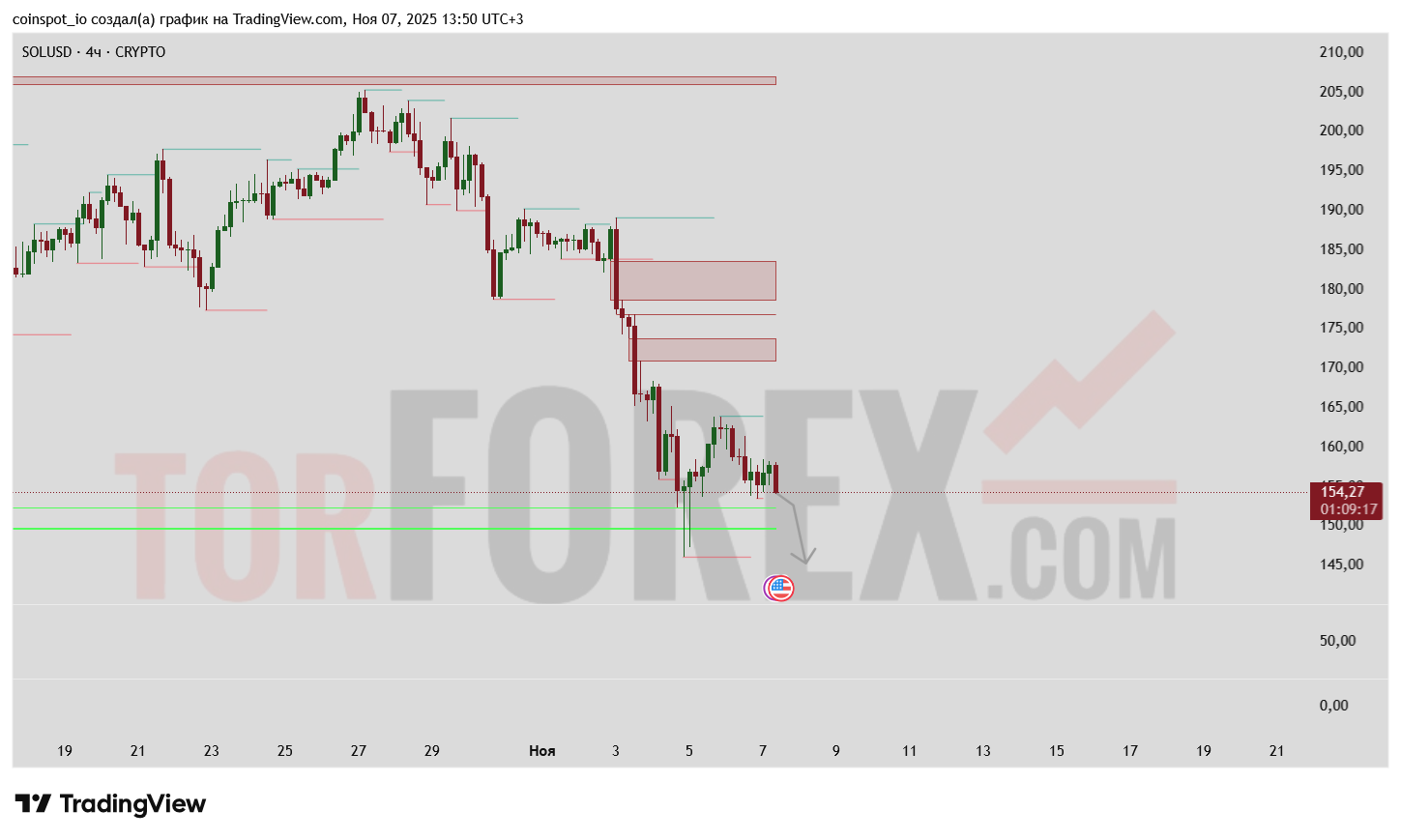 - Зоны спроса: 150–152 — область поддержки, удерживающая цену от более глубокого падения.