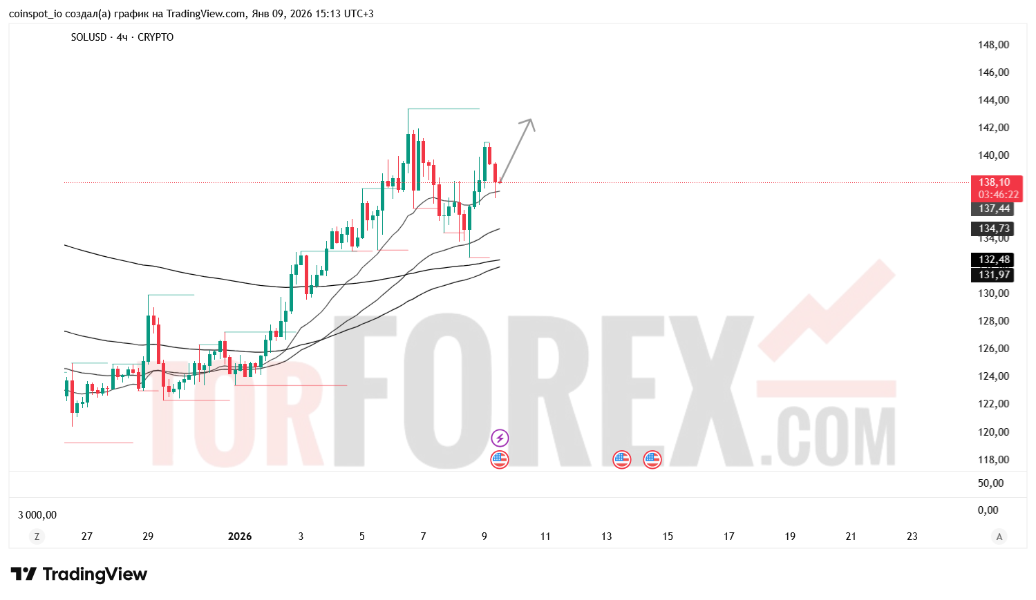 На 10 января 2026 года SOL/USD сохраняет нейтрально-бычью структуру с признаками консолидации. Основной сценарий — восстановление к 142.00–146.50 USD при пробое зоны сопротивления. Альтернативный сценарий — откат к 133.13–131.46 USD при отказе от уровня 138.21 USD.