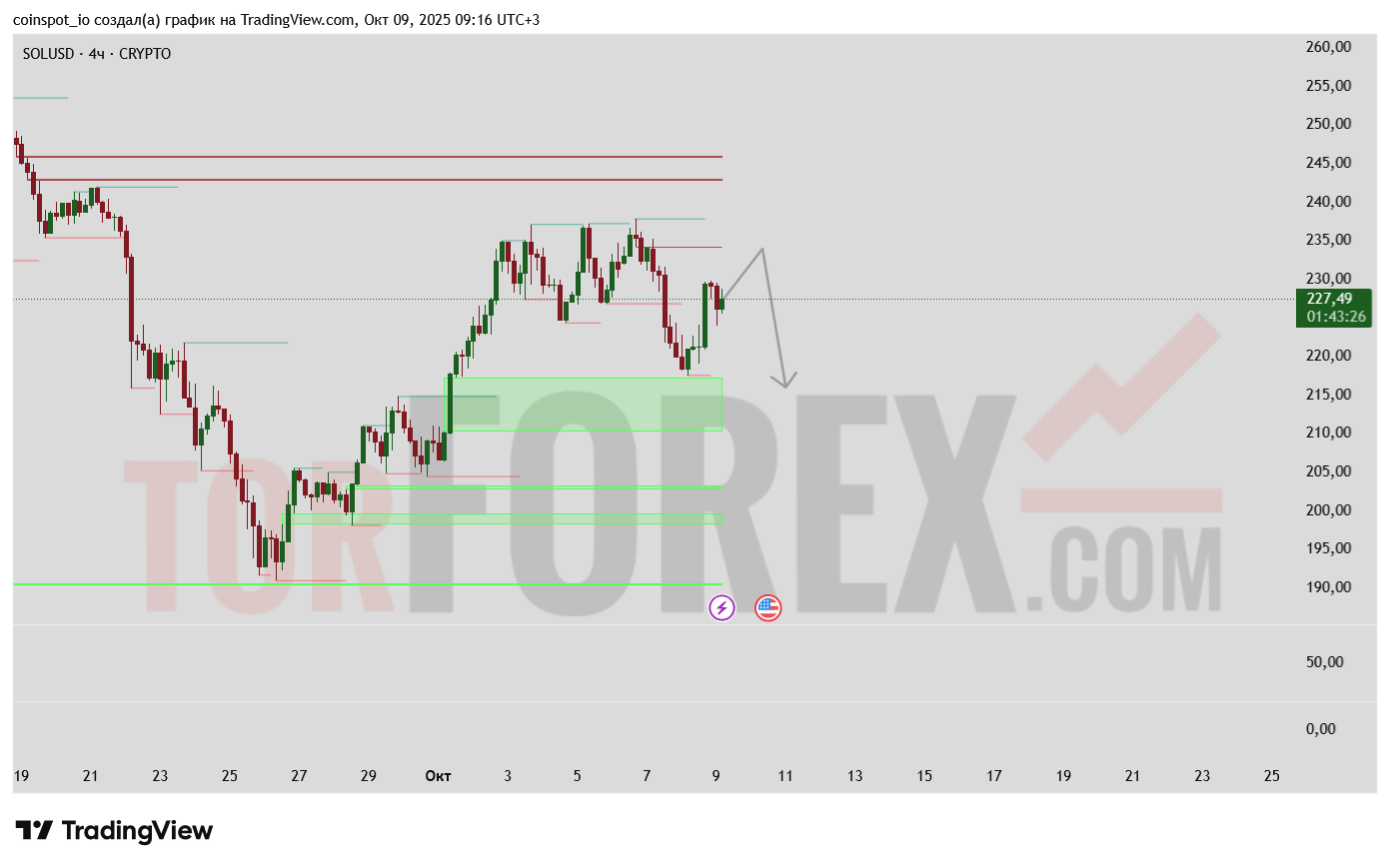 График SOL/USD повторно тестирует зону поддержки 220-225 USD, от которой ранее происходили отскоки. Удержание или пробой этого уровня определит среднесрочную динамику.