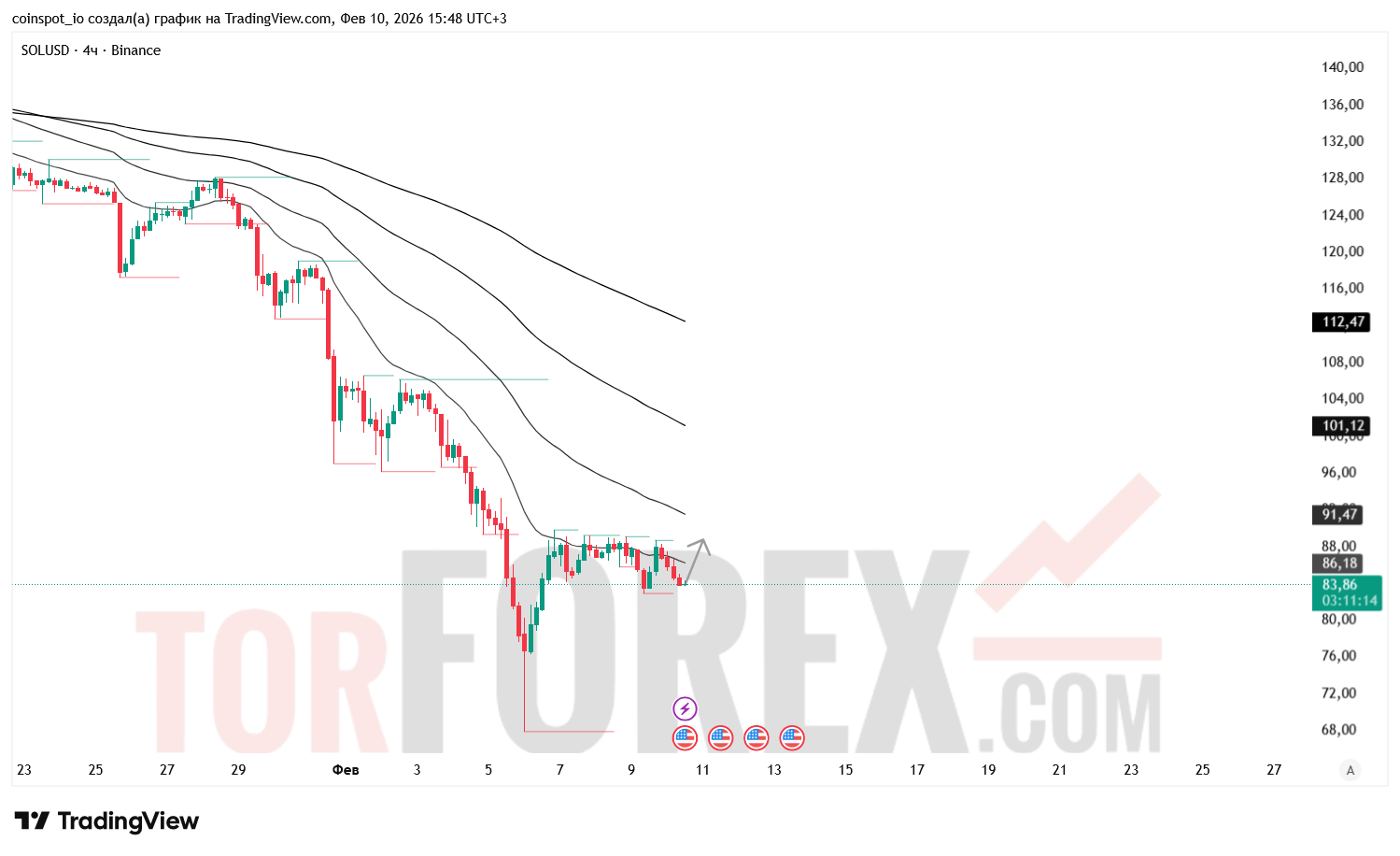 SOL/USD на 4‑часовом таймфрейме продолжает движение в нисходящей структуре, удерживаясь под ключевыми динамическими уровнями и формируя очередную волну давления продавцов. Цена закрепилась в районе 84 USD, где наблюдается локальная консолидация после обновления минимума. На 11 февраля 2026 года основное внимание смещается к реакции цены на FVG‑зоны, структуру Pivot High/Low и конфигурацию EMA‑ленты, которые определяют ближайшие уровни ликвидности и возможные точки разворота.