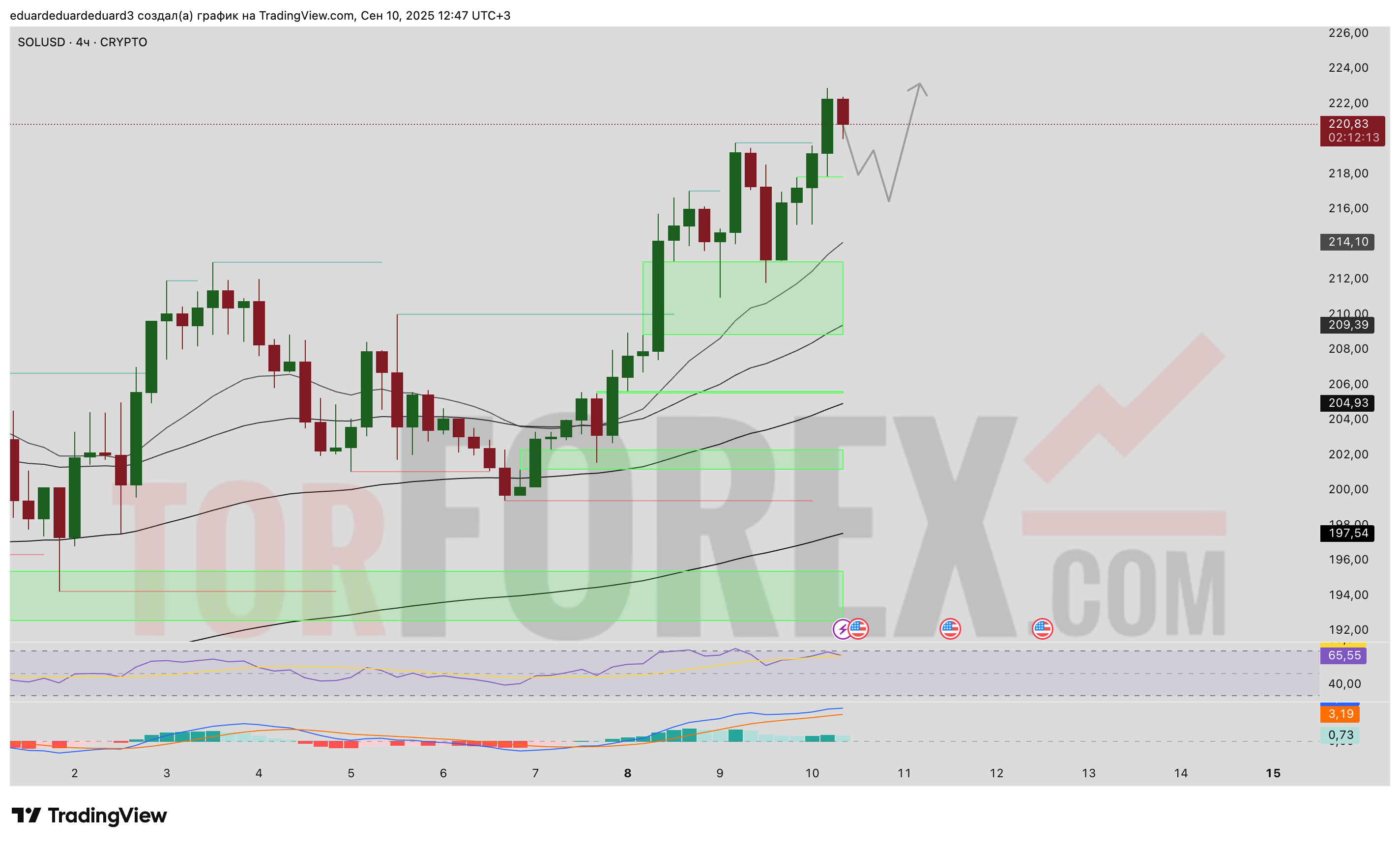 Потенциальные лонг-входы: при откате к 214–210 долларов с целями 222–228 и возможным расширением к 235–240.