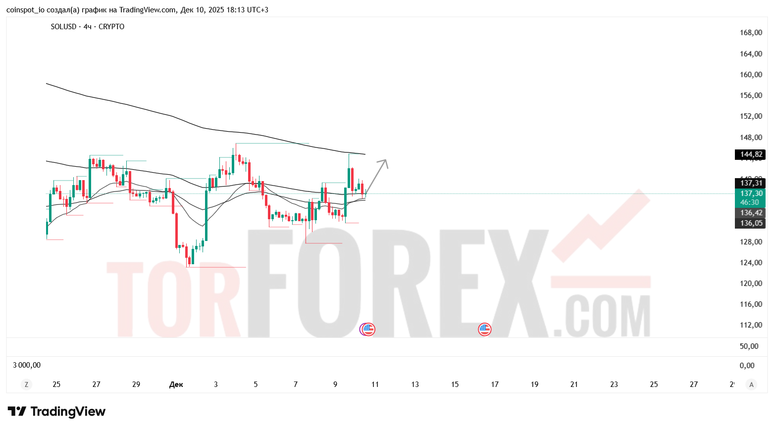 На 11 декабря 2025 года SOL/USD демонстрирует признаки консолидации. Основной сценарий — рост к 140.00–143.00 USD при пробое сопротивления. Альтернативный сценарий — снижение к 131.00–128.50 USD при отказе от уровня 137.01 USD.