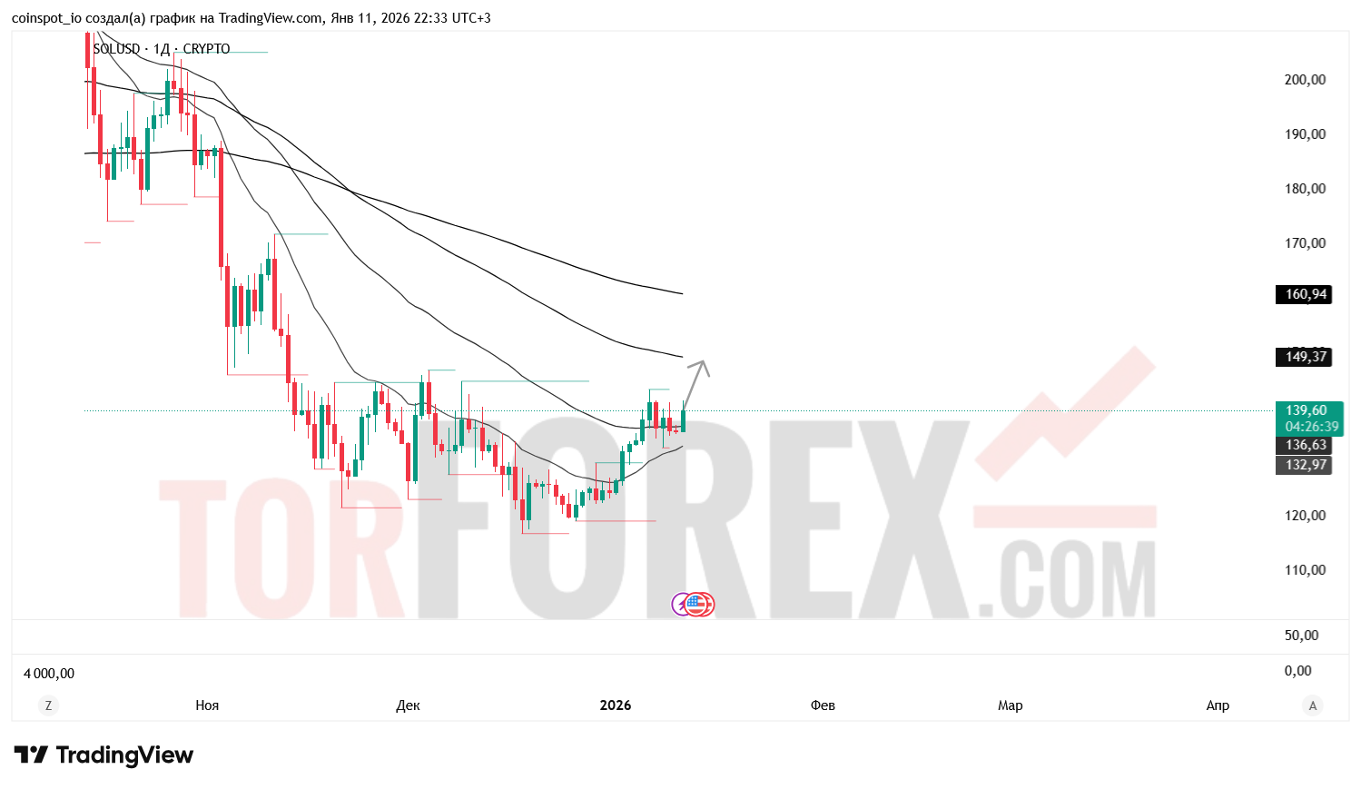На неделю 11–18 января 2026 года SOL/USD сохраняет нейтрально-бычью структуру с признаками ускорения импульса. Основной сценарий — продолжение роста к 144.50–148.50 USD при пробое зоны сопротивления. Альтернативный сценарий — откат к 133.13–131.46 USD при отказе от уровня 139.63 USD.