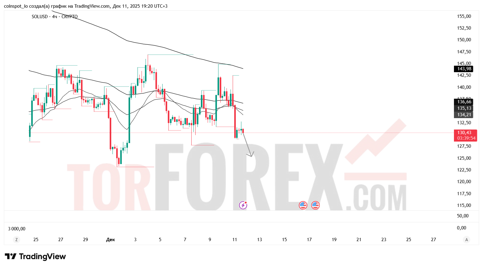 На 12 декабря 2025 года SOL/USD демонстрирует признаки разворота вниз. Основной сценарий — снижение к 128.00–125.50 USD при пробое поддержки. Альтернативный сценарий — восстановление к 136.00–138.50 USD при возврате выше 133.50 USD.