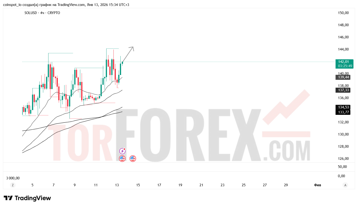 На 14 января 2026 года SOL/USD сохраняет нейтрально-бычью структуру с признаками ускорения импульса. Основной сценарий — продолжение роста к 144.00–147.00 USD при пробое зоны сопротивления. Альтернативный сценарий — откат к 138.50–137.00 USD при отказе от уровня 141.81 USD.