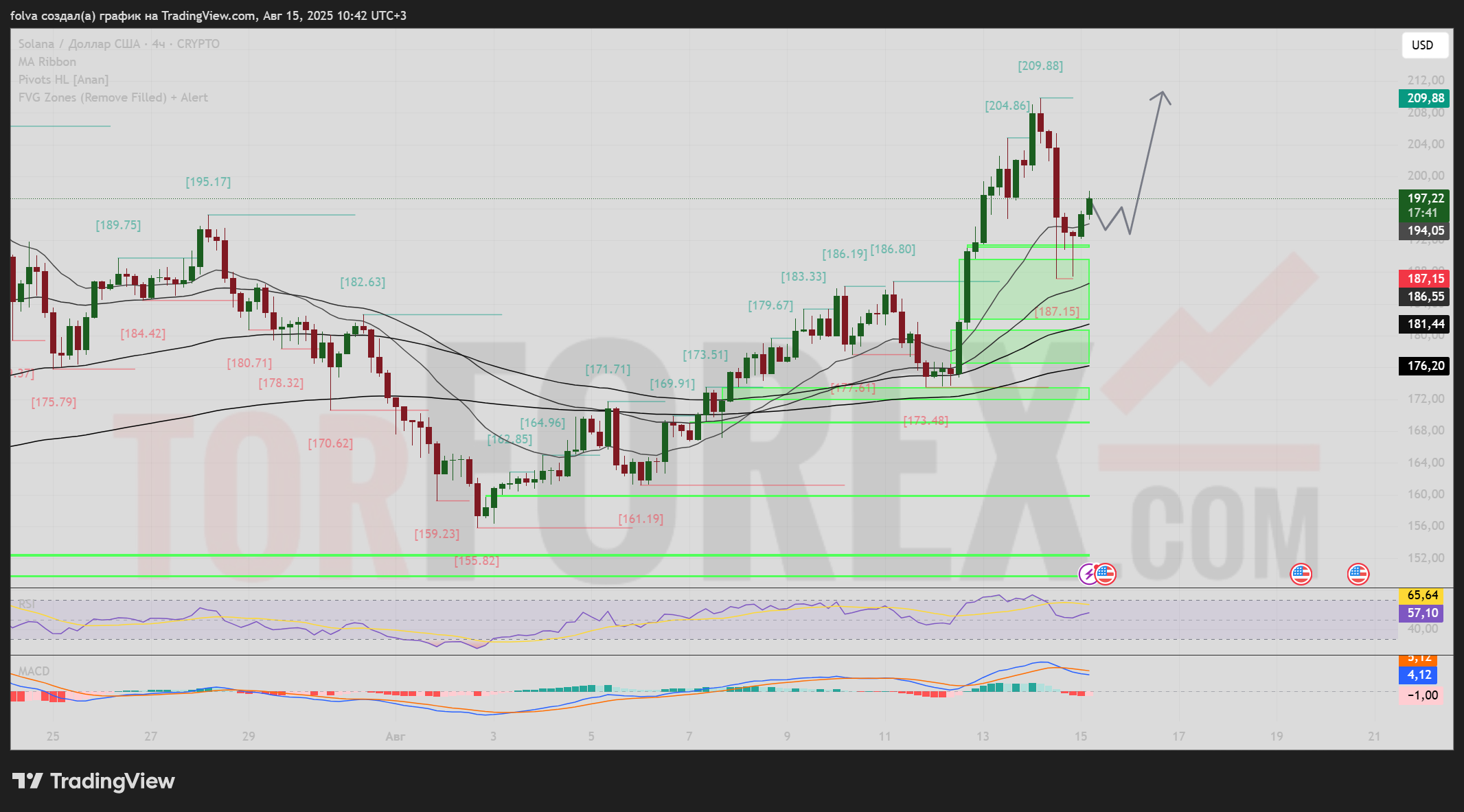 Торговая пара SOL/USD завершает текущую четырёхчасовую сессию на отметке $197,07, продолжая восстанавливаться после резкой коррекции с локального максимума $209,88. Несмотря на откат, структура рынка сохраняет бычий уклон: цена удержалась в зоне Fair Value Gap $187,15–$181,43 и осталась выше ключевых средних, что указывает на активность покупателей.