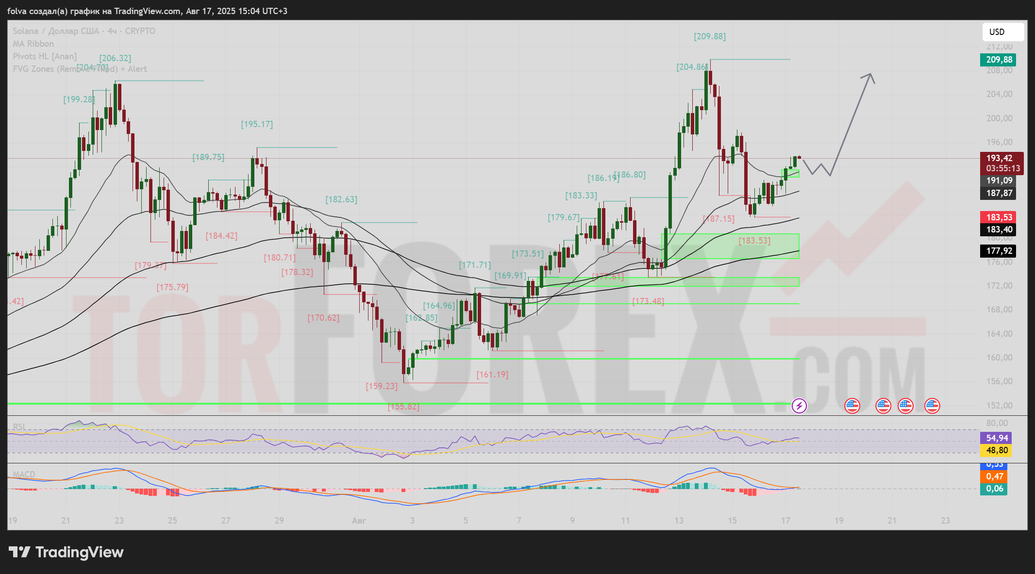 Если Solana удержится выше уровня 191–187, можно ожидать продолжение роста. Ближайшие цели:
