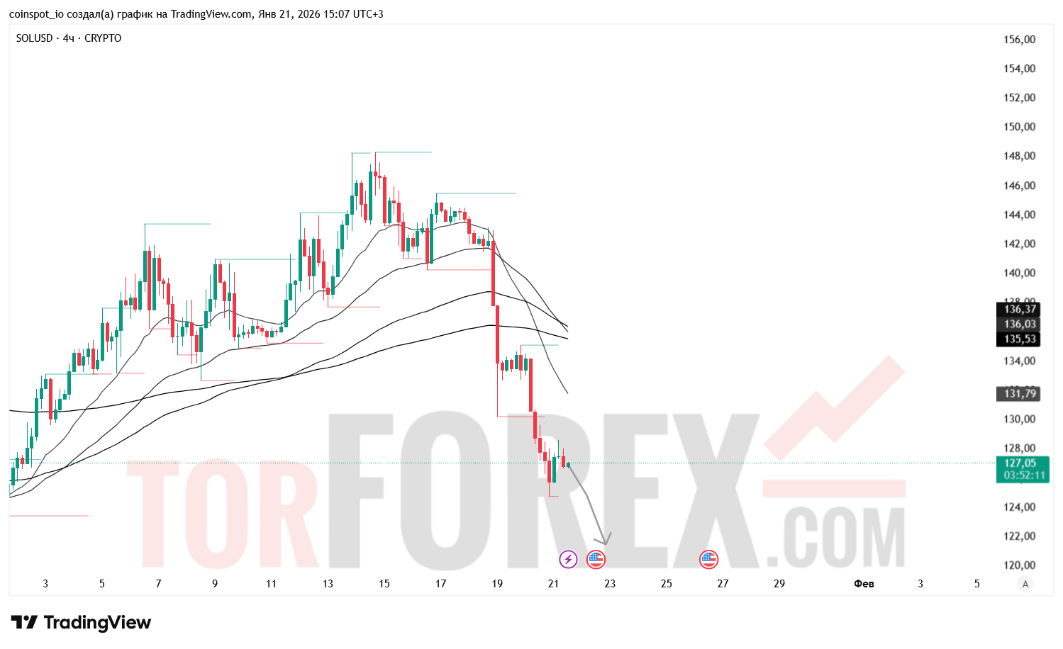 На 22 января 2026 года SOL/USD сохраняет медвежью структуру с признаками локального отскока. Основной сценарий — снижение к 123.60–121.00 USD при пробое поддержки. Альтернативный сценарий — коррекция к 130.80–132.00 USD при отскоке от 125.20.