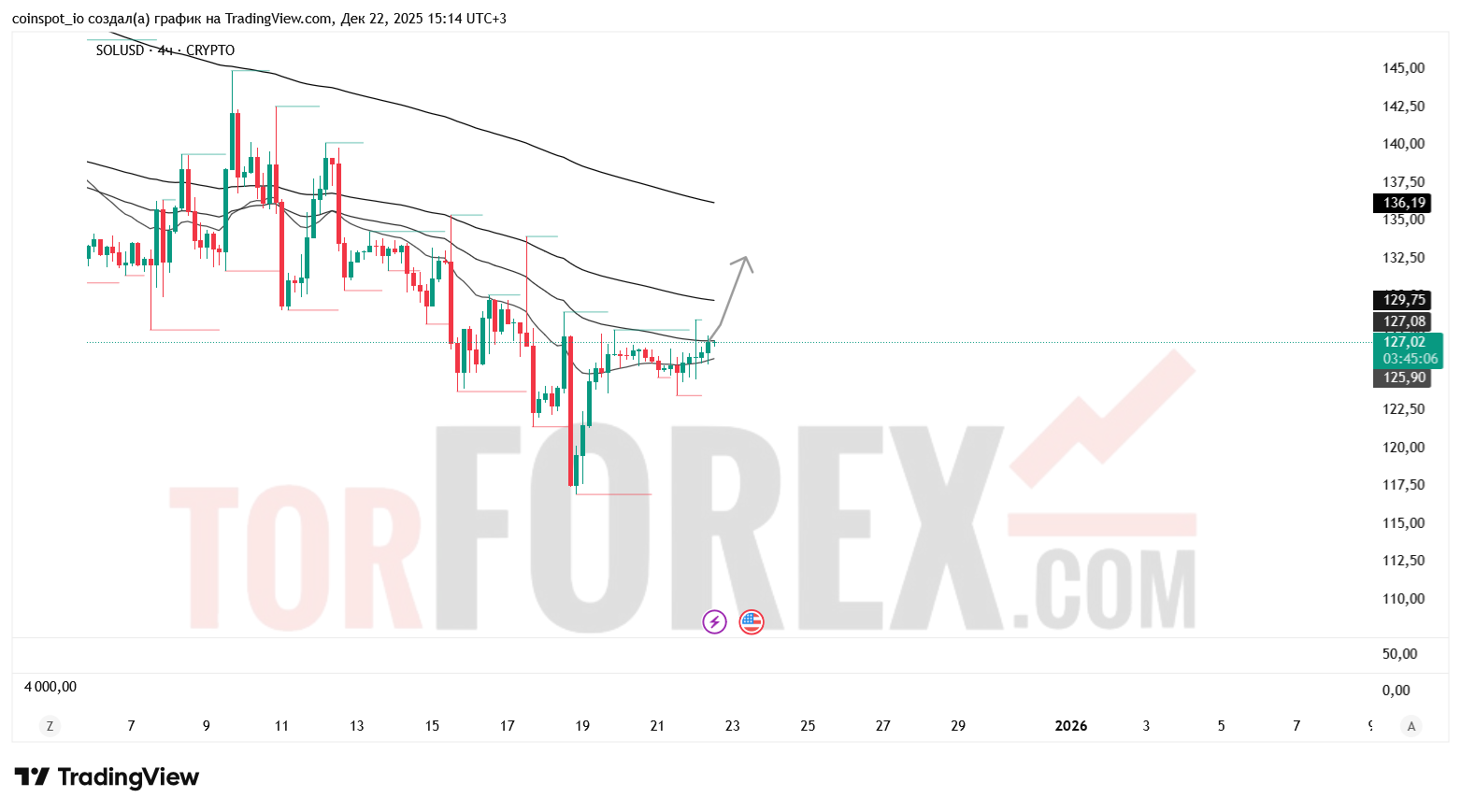На 23 декабря 2025 года SOL/USD демонстрирует признаки краткосрочной стабилизации. Основной сценарий — рост к 129.74–132.50 USD при пробое EMA 50. Альтернативный сценарий — снижение к 122.50–120.00 USD при отказе от уровня 127 USD.