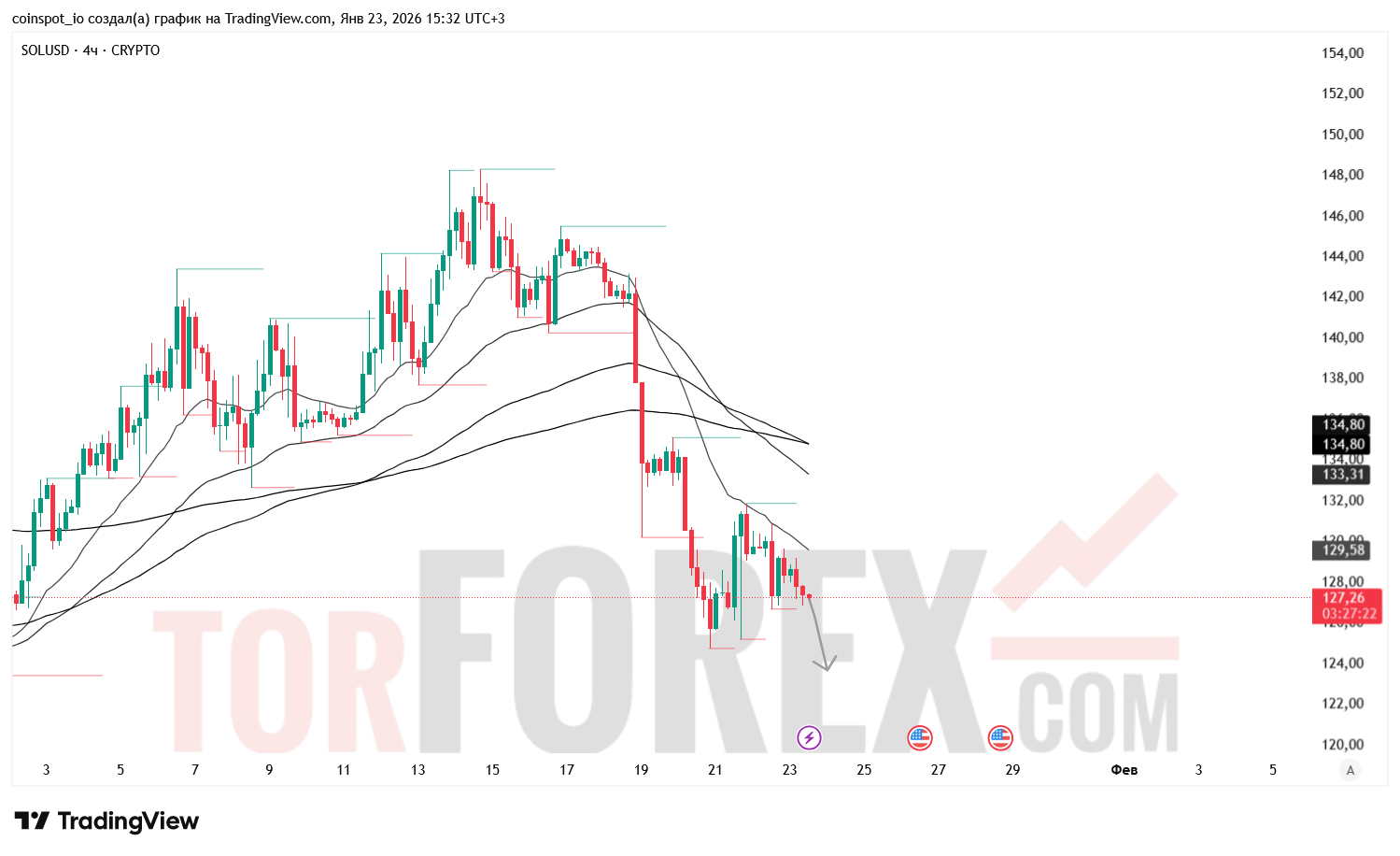 На 24 января 2026 года SOL/USD сохраняет медвежью структуру с признаками локального отскока. Основной сценарий — снижение к 124.50–122.80 USD при пробое поддержки. Альтернативный сценарий — коррекция к 130.80–132.00 USD при отскоке от 126.00.