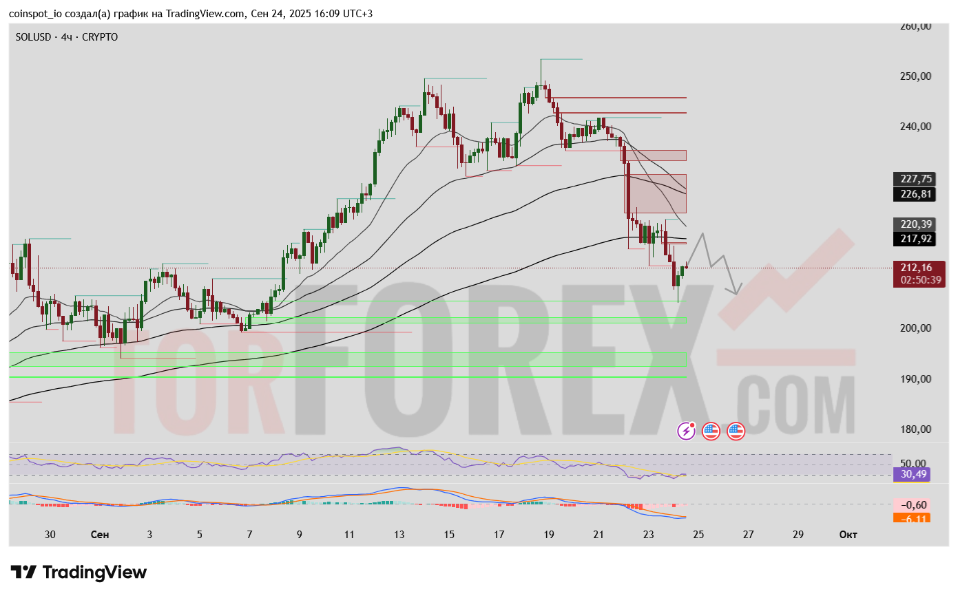 Торговая пара SOL/USD пережила резкий откат после локального пика у 245–248. На 4H-графике отмечается импульсное снижение с пробоем EMA-ленты 20/50/100/200 и формированием медвежьих FVG. Текущая цена колеблется в районе 212, отскакивая от кластера спроса 206–209. Ключевая задача дня — понять, перерастёт ли отскок в коррекцию к зонам неэффективности или продолжится трендовое снижение к более глубоким поддержкам.