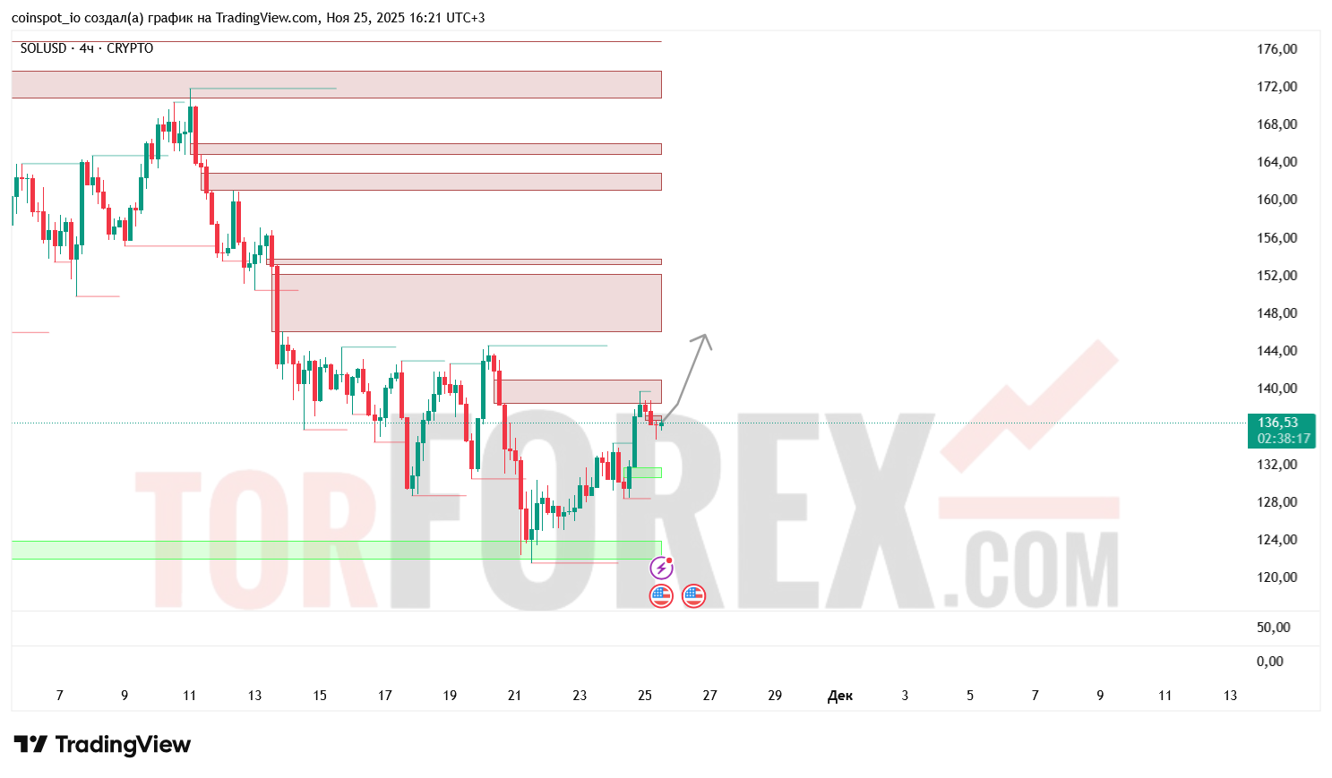 На 26 ноября 2025 года SOL/USD демонстрирует признаки устойчивого роста. Основной сценарий — движение к 142.00 и 145.00 USD. Торговая идея: открытие длинных позиций при закреплении выше 138.00 USD, с стоп-лоссом ниже 135.50 USD. Альтернативный сценарий — шорт при отказе от 138.00 USD, с целями 130.00 и 128.00 USD, и стоп-лоссом выше 139.50 USD.