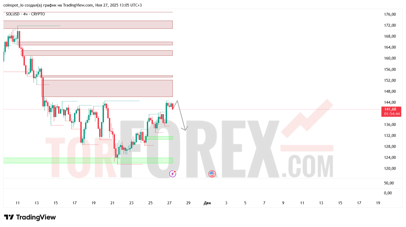 - Верхняя FVG: 144.00–147.50 USD — незаполненная область импульса, может быть целью при пробое сопротивления