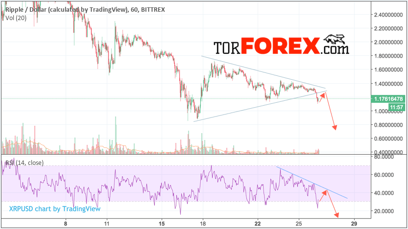 Котировки Ripple XRP/USD торгуются на уровне 1.17 и продолжают движение в рамках начала отработки модели «Треугольник». В прошлом прогнозе Ripple мы ожидали выход за пределы модели вниз. На данный момент стоит ожидать попытку теста пробитой границы модели вблизи области 1.25 и продолжения падения в область ниже уровня 0.80.