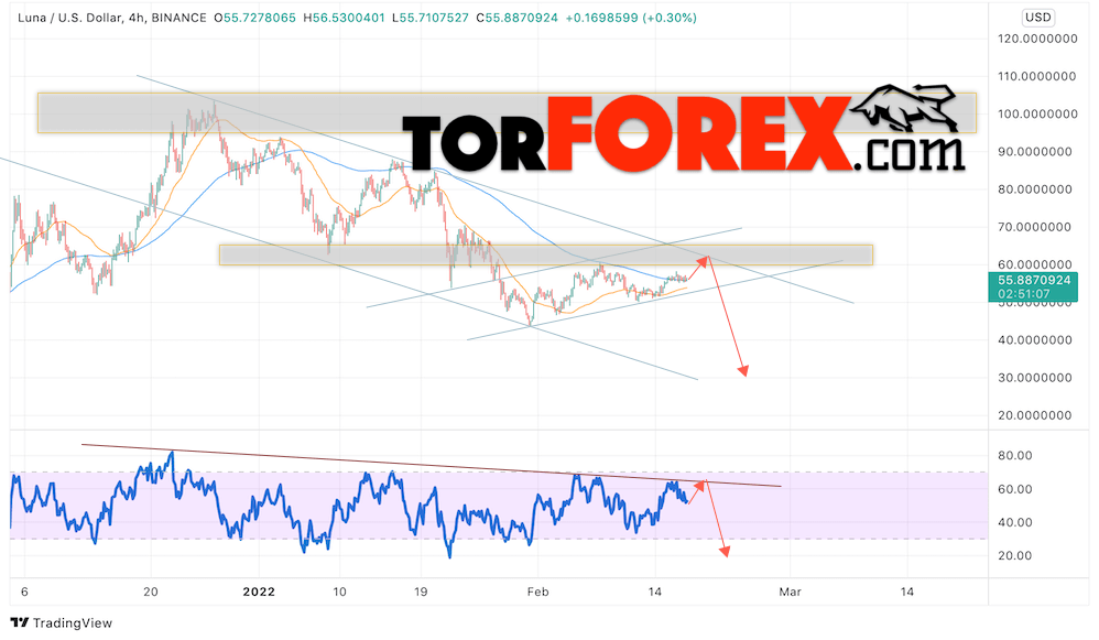 Таким образом, Terra прогноз на 18 февраля 2022 предполагает попытку коррекции и тест области сопротивления вблизи уровня 59.55. Откуда стоит ожидать отскок вниз и продолжения падения LUNA/USD в область ниже уровня 30.05. Дополнительным сигналом в пользу снижения Terra выступит тест линии тренда на индикаторе относительной силы. Отменой варианта падения станет сильный рост и пробой области 70.05. Это укажет на продолжение подъёма криптовалюты с целью выше уровня 75.05.