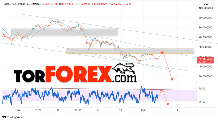 В пользу снижения котировок LUNA/USD выступит тест линии тренда на индикаторе относительной силы. Вторым сигналом станет отскок от верхней границы нисходящего канала. Отменой варианта снижения монеты станет сильный рост стоимости актива и пробой области 61.55. Это укажет на пробой области сопротивления и продолжение роста курса криптовалюты с потенциальной целью выше уровня 65.55. С пробоем области поддержки и закрытием котировок ниже уровня 41.55 стоит ожидать подтверждения развития нисходящего импульса тенденции по Terra.