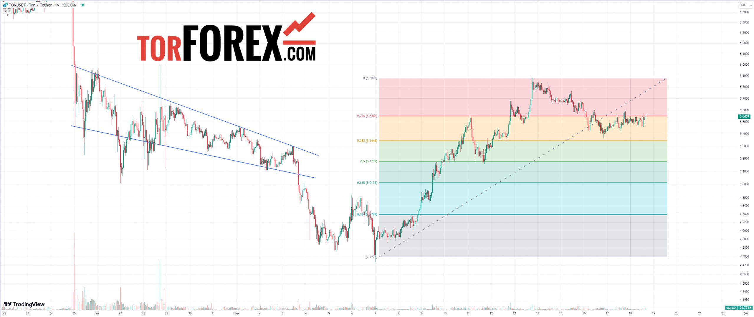 Тонкоин прогноз на сегодня ожидается в направлении продолжения коррекции к следующим ключевым уровням сетки Фибоначчи: 38,2% — $5.4 и 50% — $5.2. То есть цена будет снижаться к отмеченным нами уровням и не на долго задерживаться на них, скорость снижения будет завесить от объема торгов.