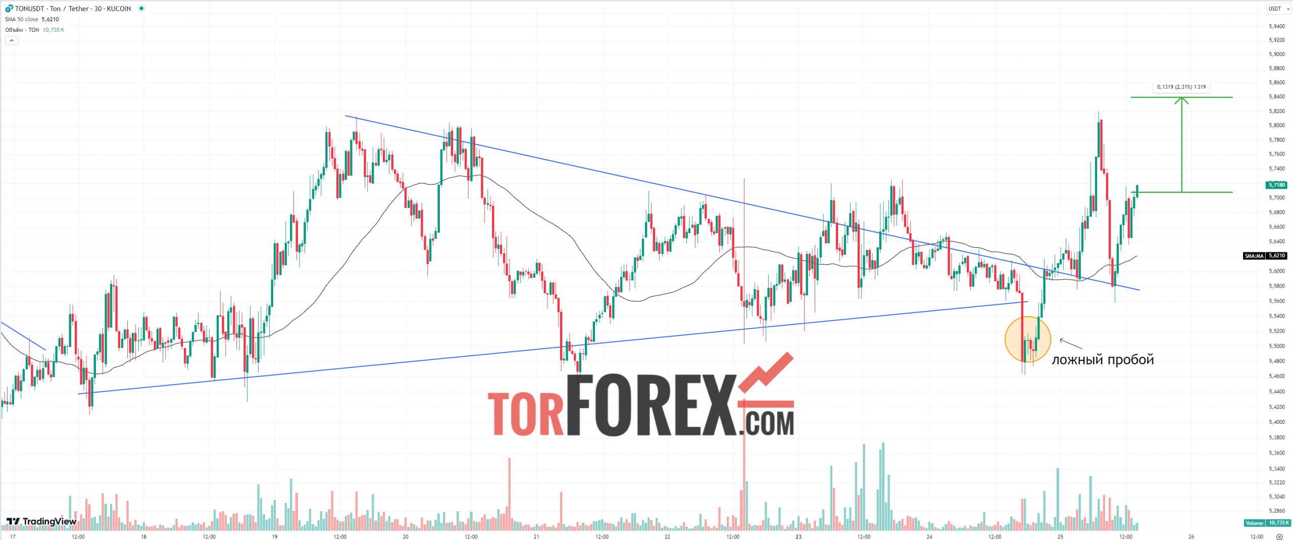 За последние сутки цена тона выросла на 2,5% и после ложного пробоя вниз, мы пробили сопротивление клина, попытки к которому предпринимались несколько дней.